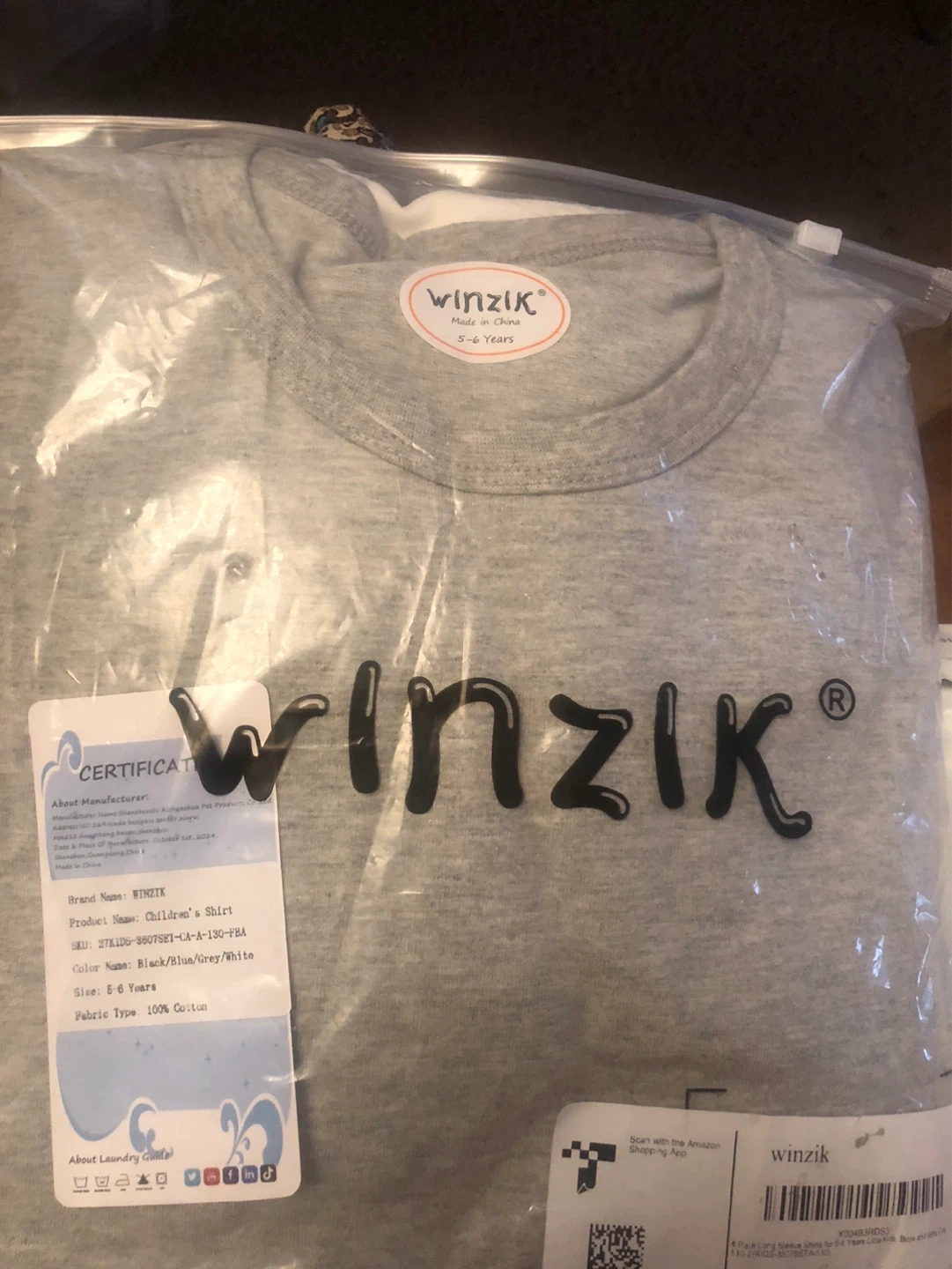 This is a Winzik brand children's shirt in a grey, blue, black ‘and white colourway full sleaves. It's madey of 100% cotton fabric. The size is for 5-6 years old. This shirt is great for everyday wear!