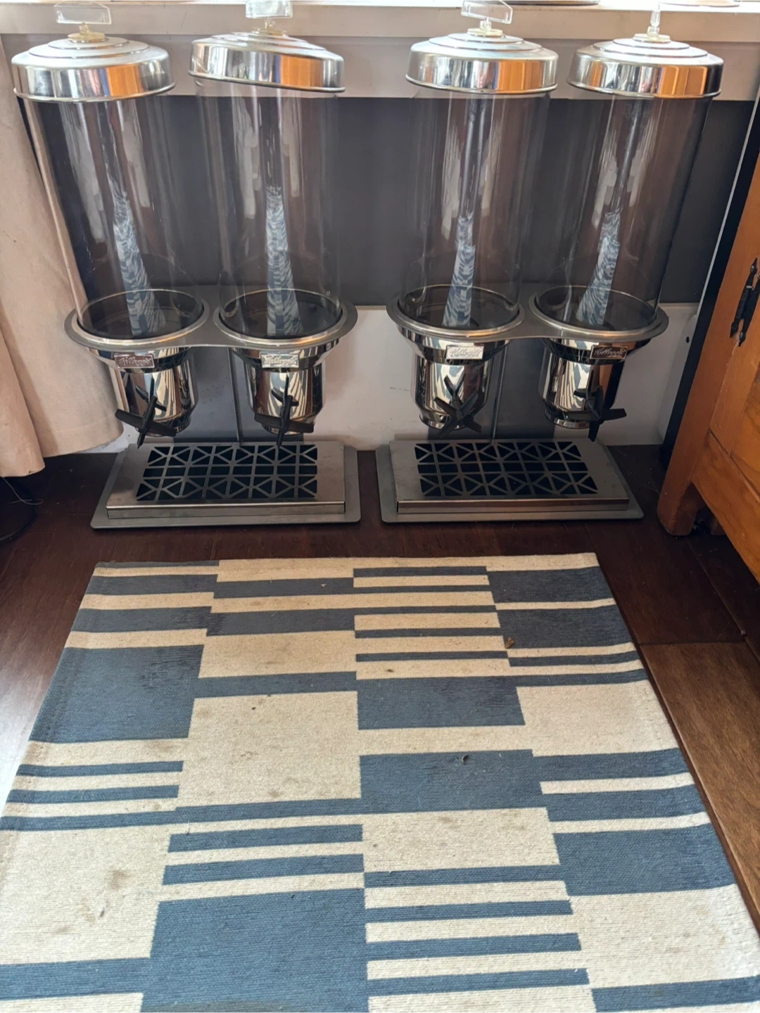 Commercial-style metal base cereal dispenser with four clear tubes and silver-tone accents. Each section features a dispensing mechanism for easy portion control. Ideal for breakfast bars or buffet settings. 14”w 26”h 8”d, with 6” x 11” h round tubes.