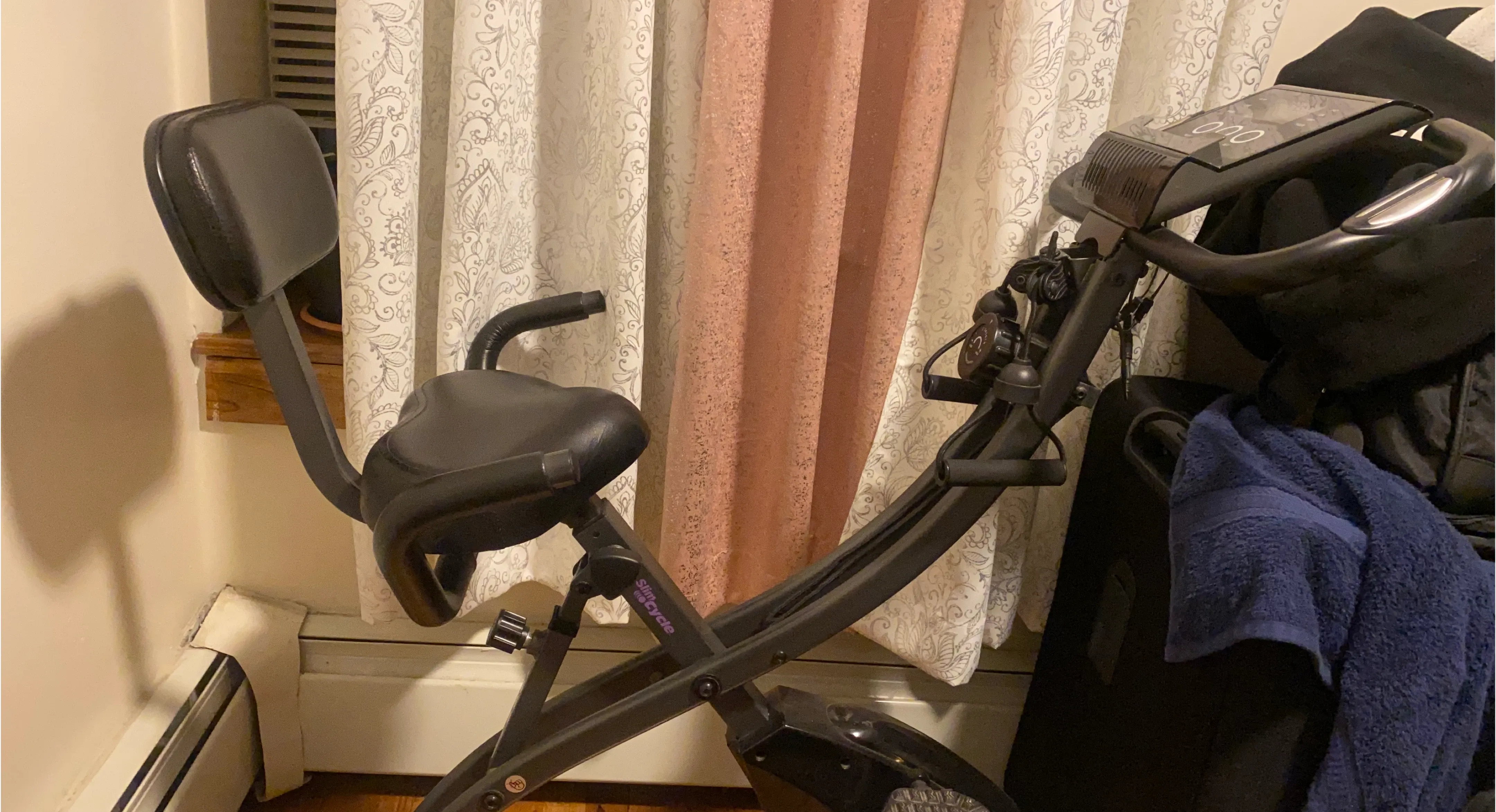 This Slim Cycle stationary bike offers a comfortable workout. It features adjustable resistance and a padded seat with backrest. The console displays speed, time, distance, and calories.