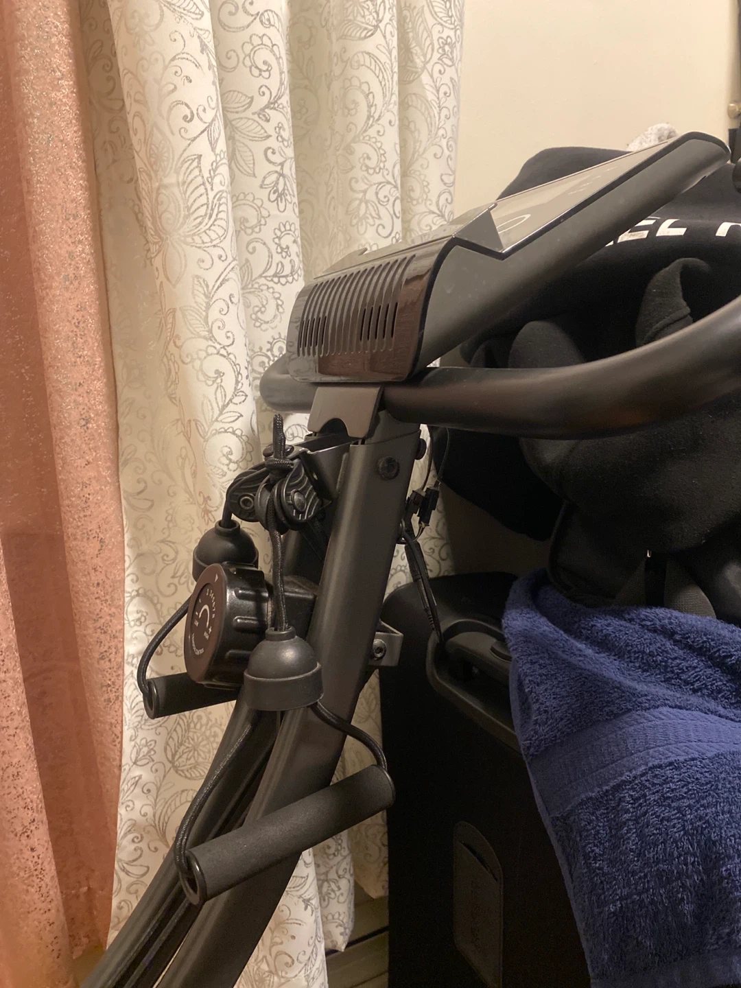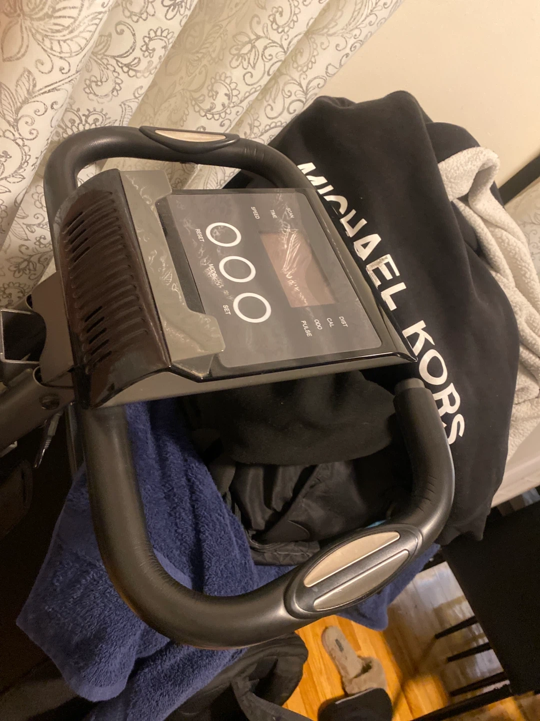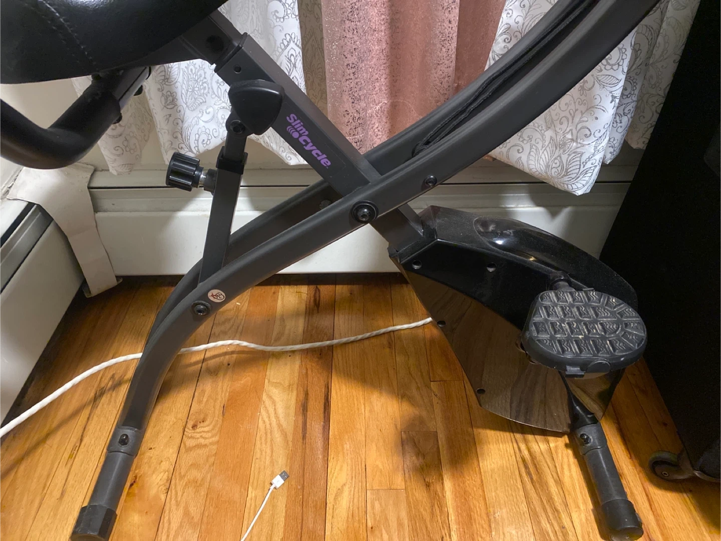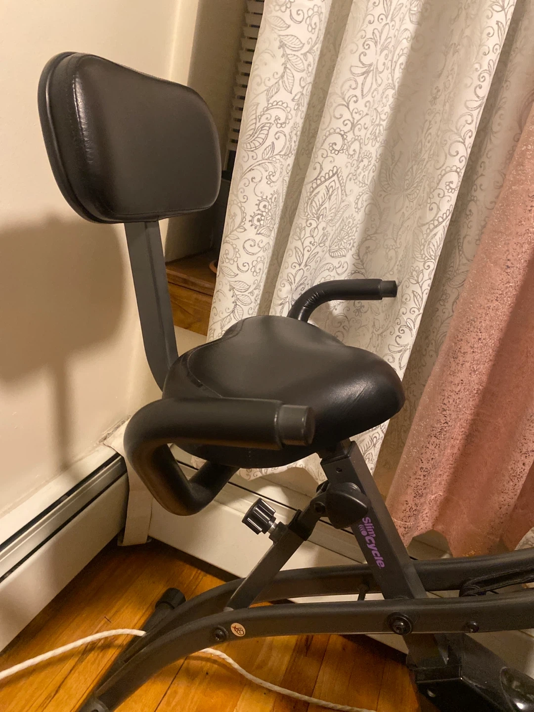 This Slim Cycle stationary bike offers a comfortable workout. It features adjustable resistance and a padded seat with backrest. The console displays speed, time, distance, and calories.