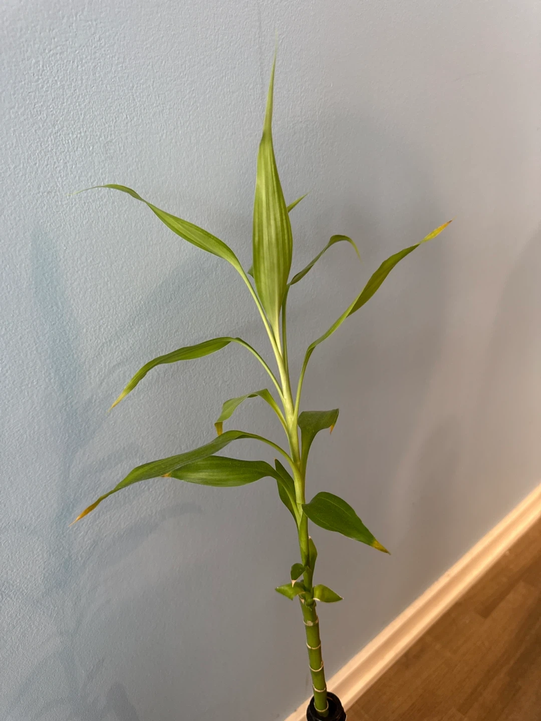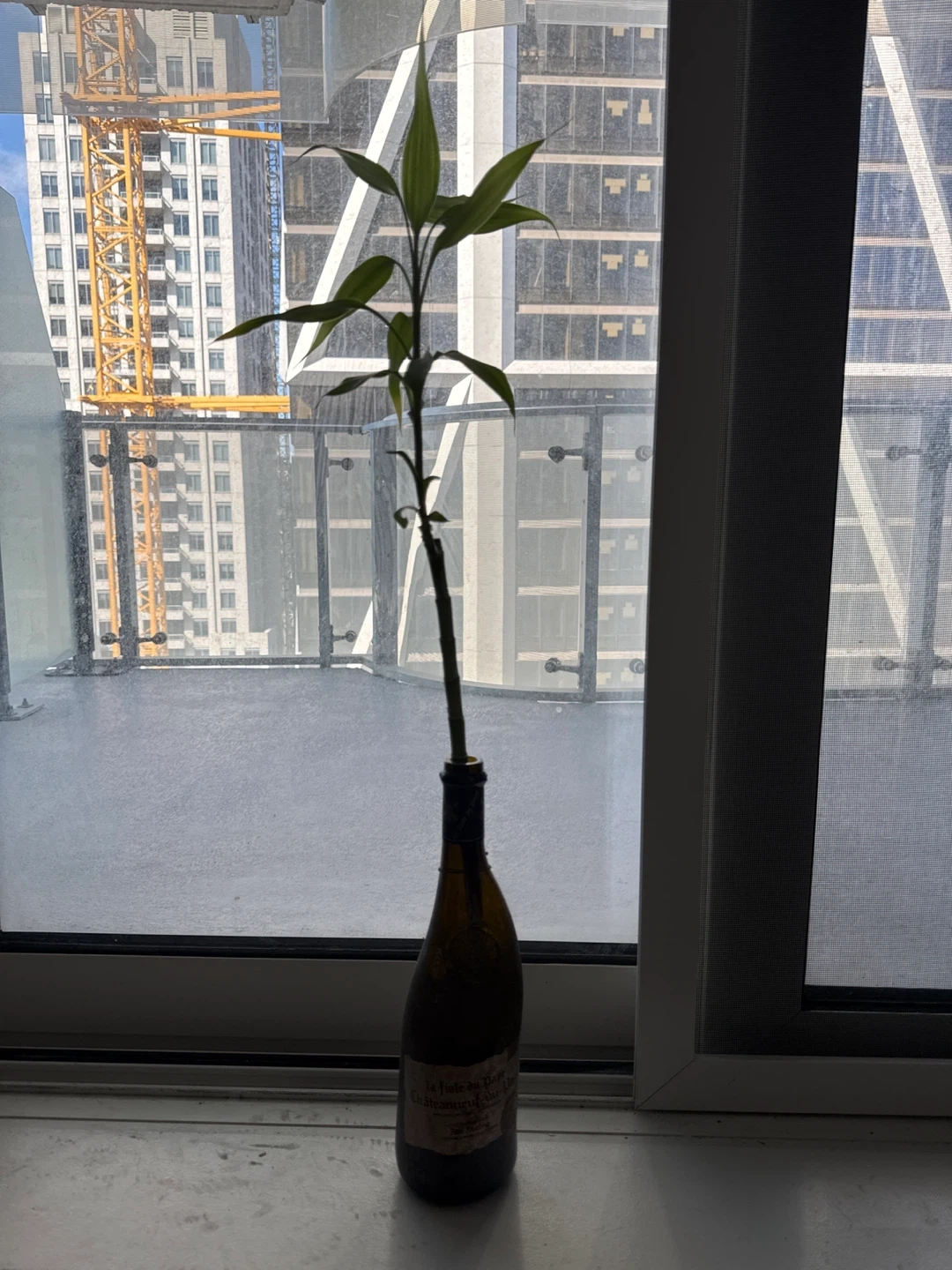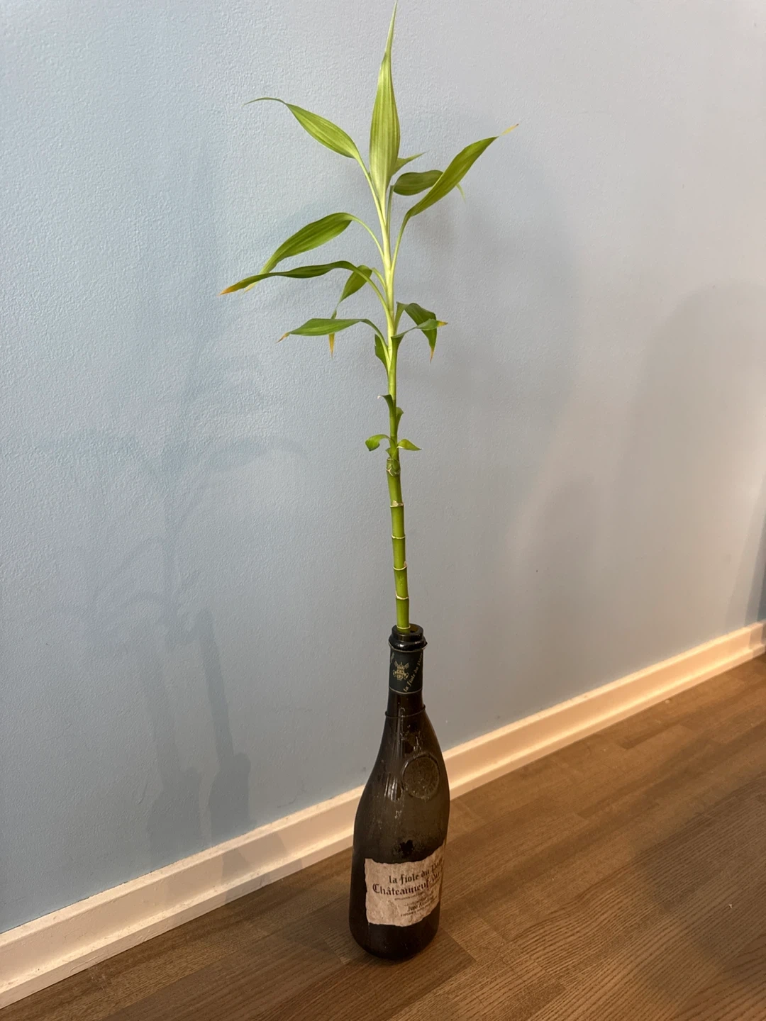 A vibrant lucky bamboo stalk growing from a repurposed wine bottle. It's a unique piece for any home or office space. This plant adds a touch of green and is known for its easy care.
