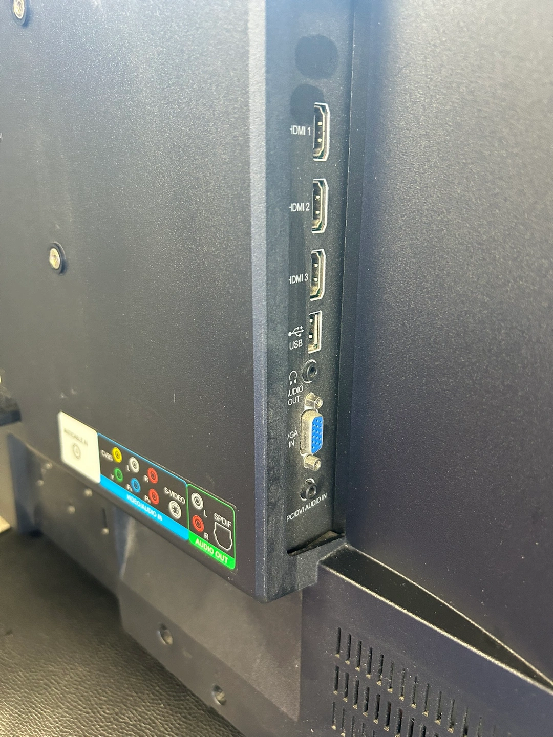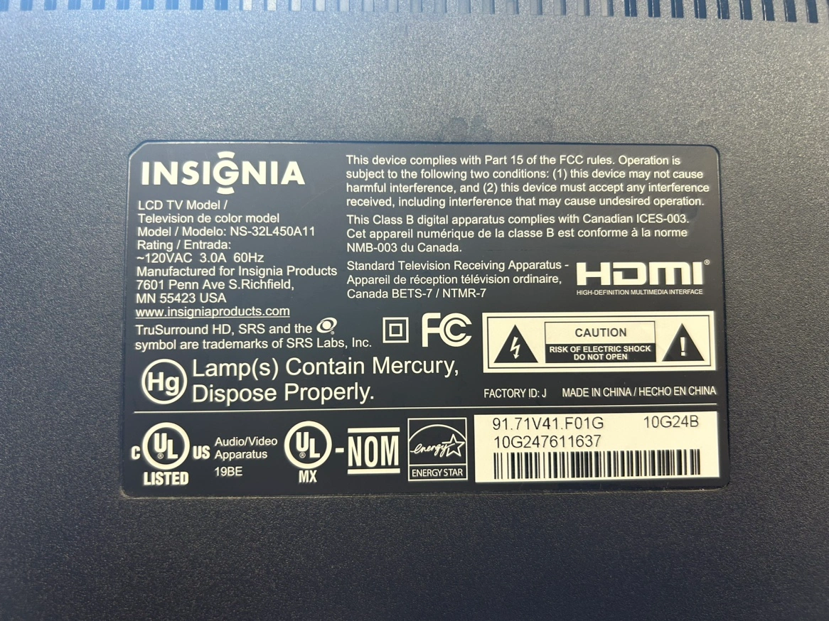 This is a black Insignia LCD TV. It has a variety of inputs and outputs including HDMI, RCA, and S-video. It also has a built-in speaker. It has a mercury-containing lamp that should be disposed of properly.