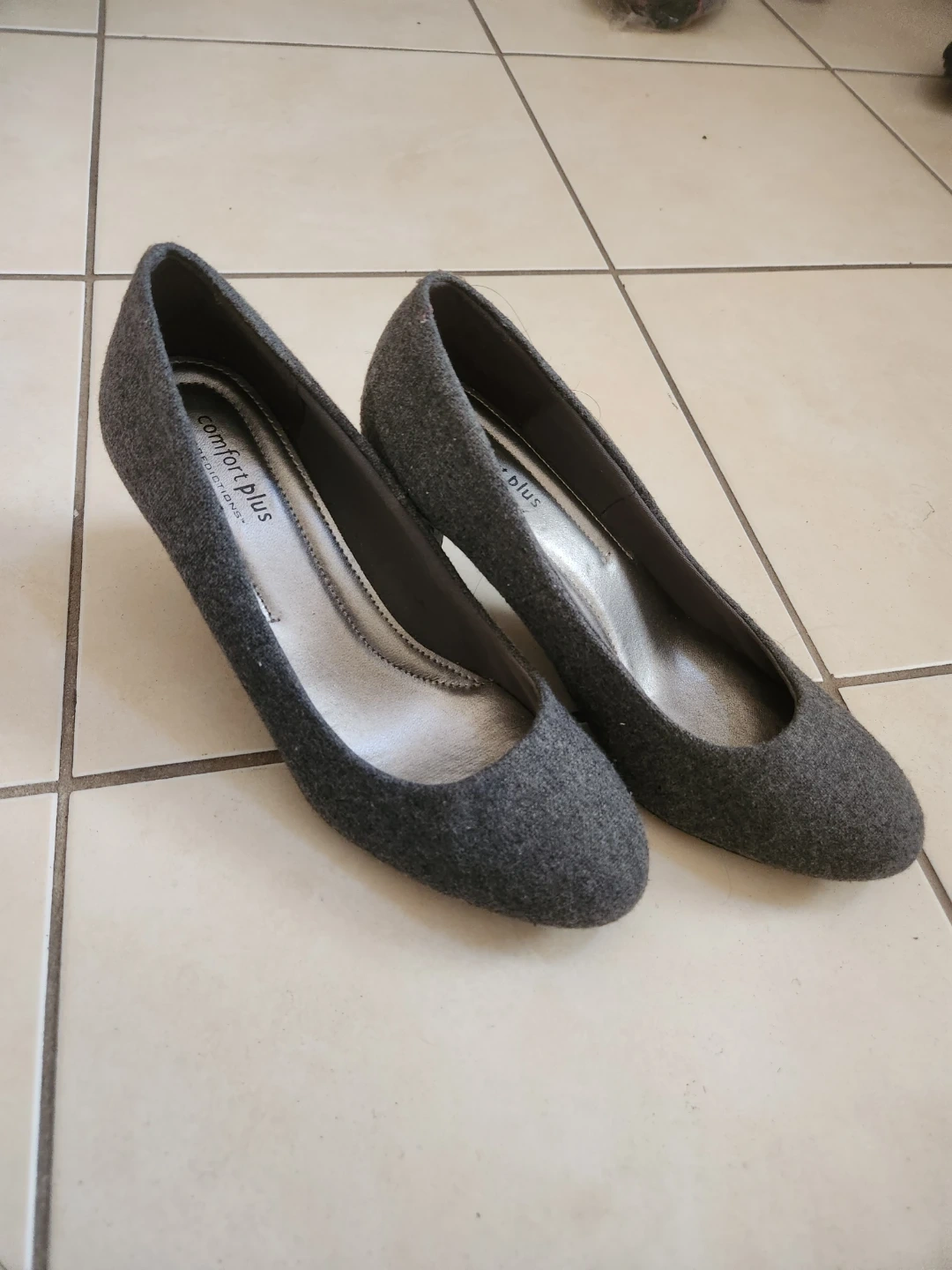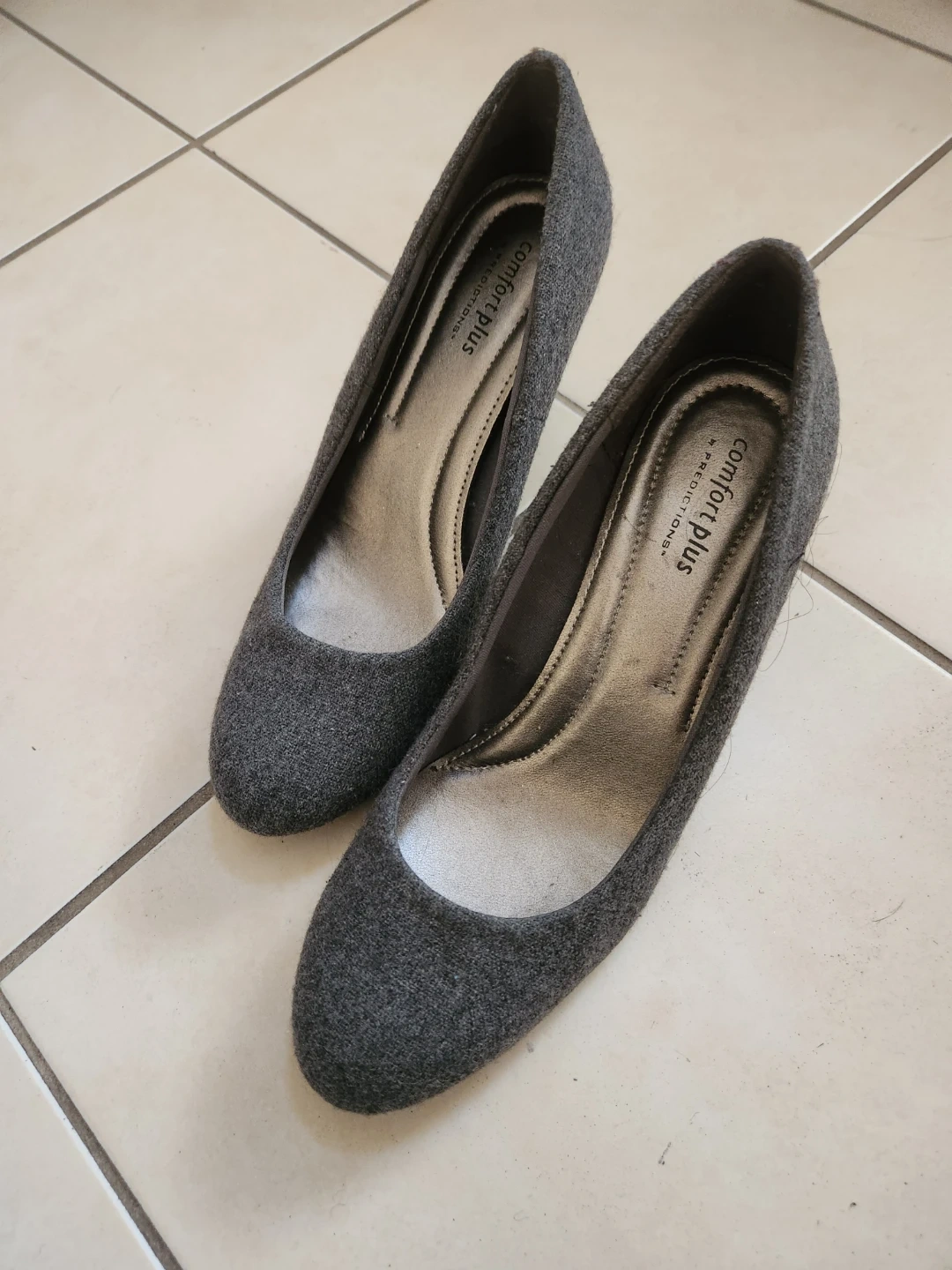 These Comfort Plus by Predictions heels are a lovely charcoal grey. They have a subtle textured finish. Made with a synthetic upper and lining for comfort.
