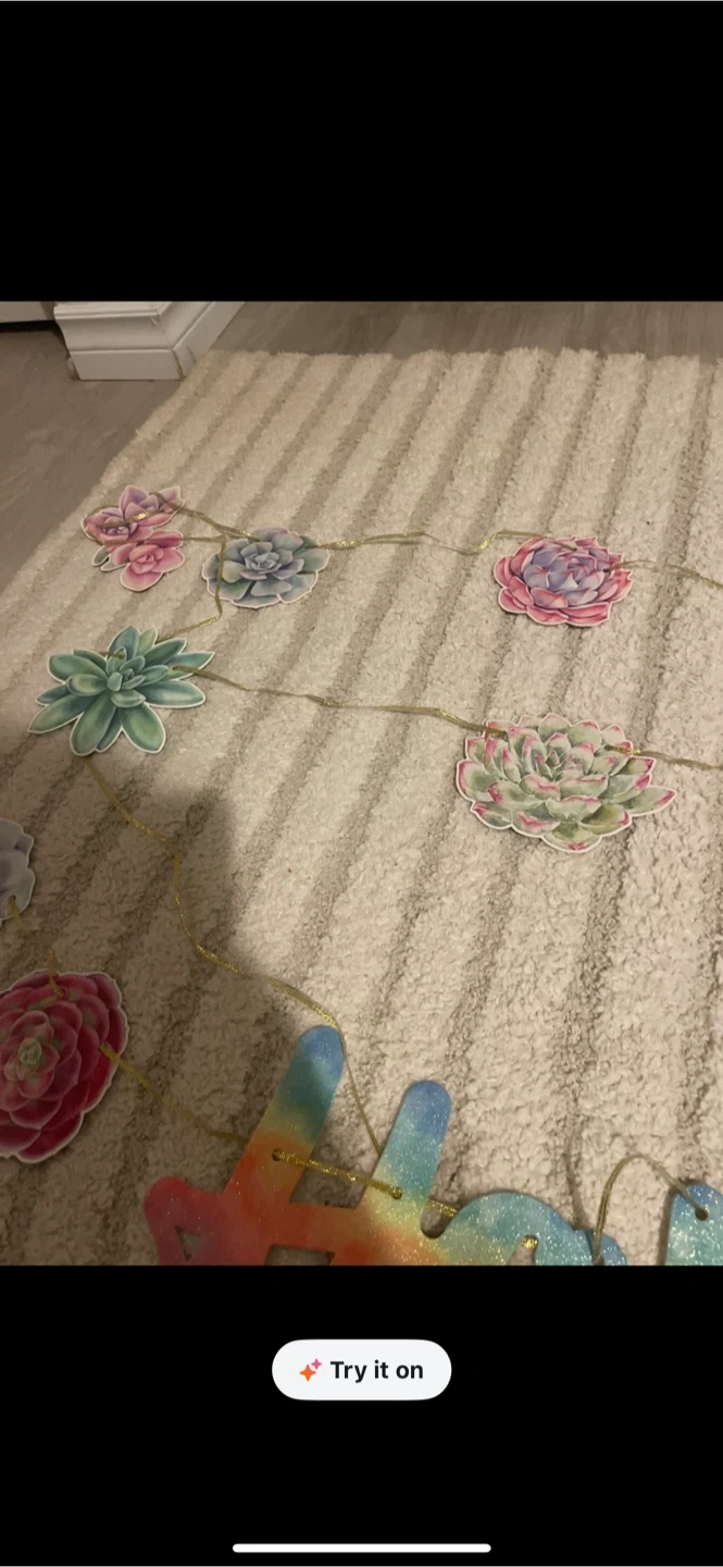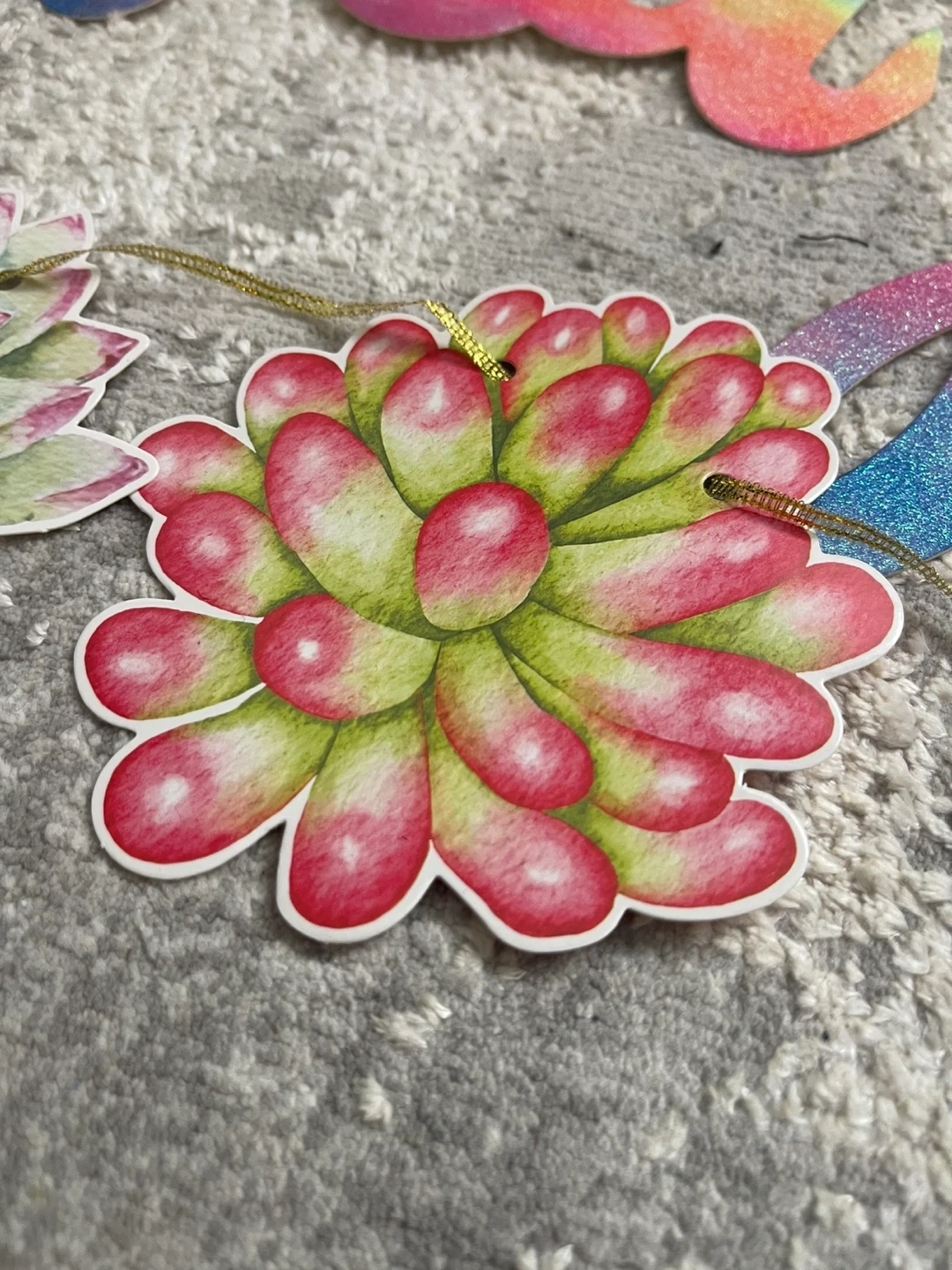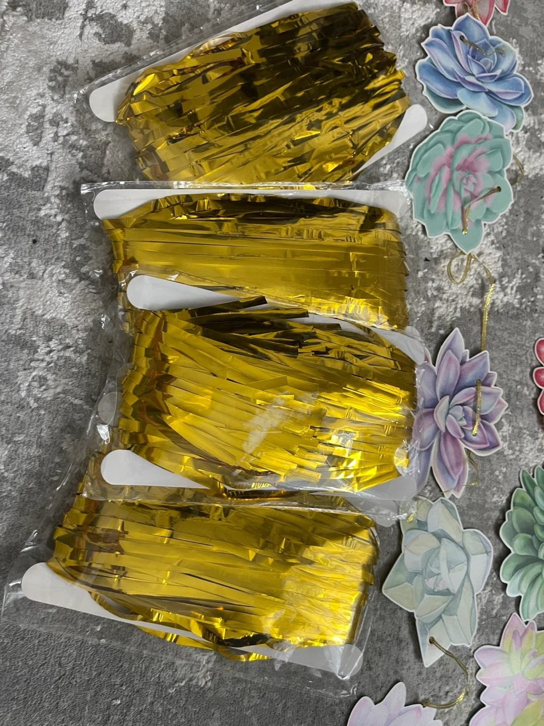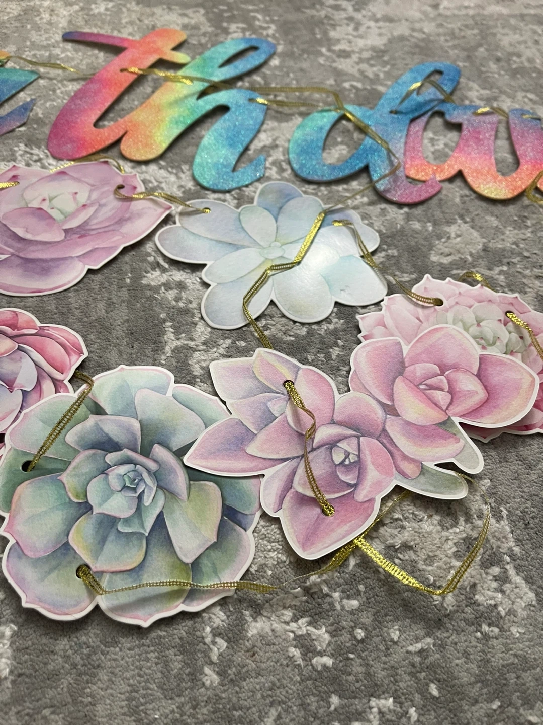 This festive banner features watercolour-style succulents a. Happy Birthday banner strung together with a gold cord. Includes four gold fringe curtain pieces for decoration cactus cup cake holder