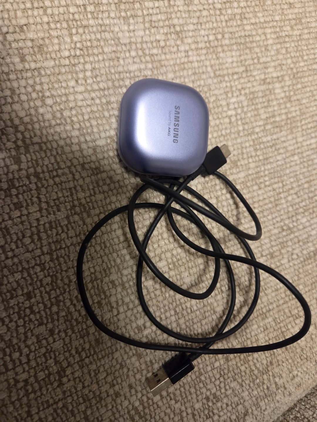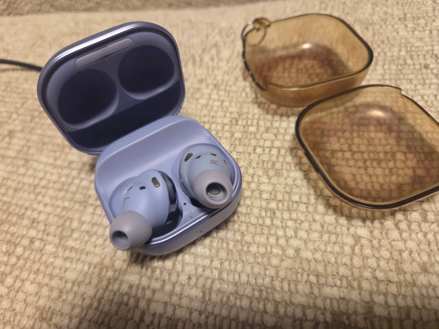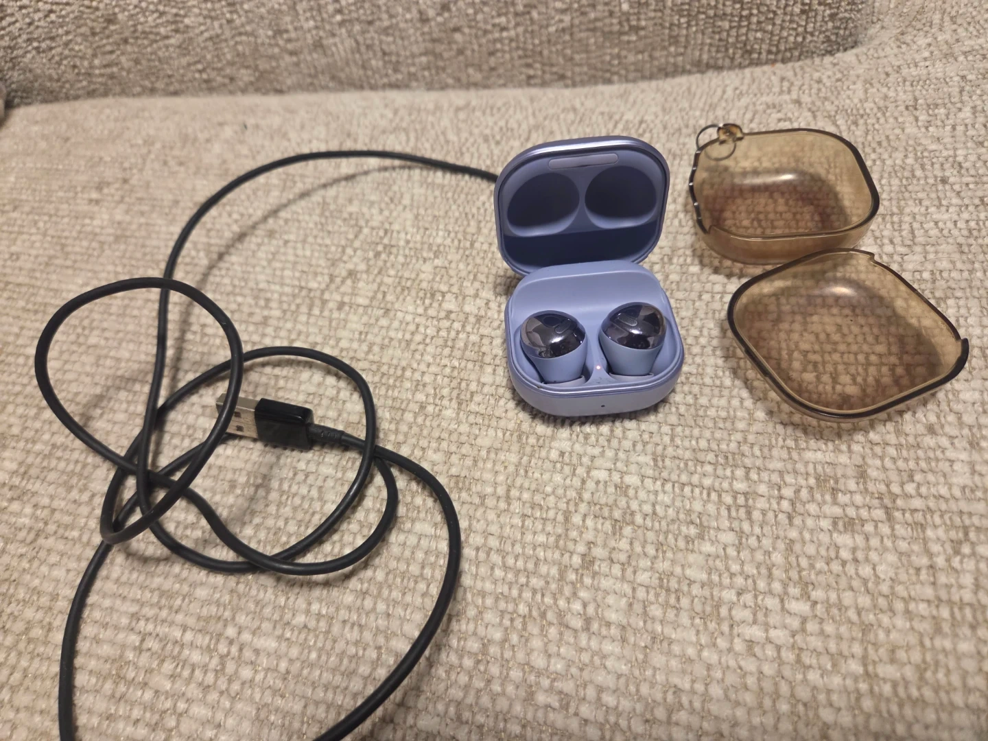 Used Samsung Galaxy Buds Pro in lavender. Includes charging case, USB-C charging cable, and two protective cases. Buds are in good condition.