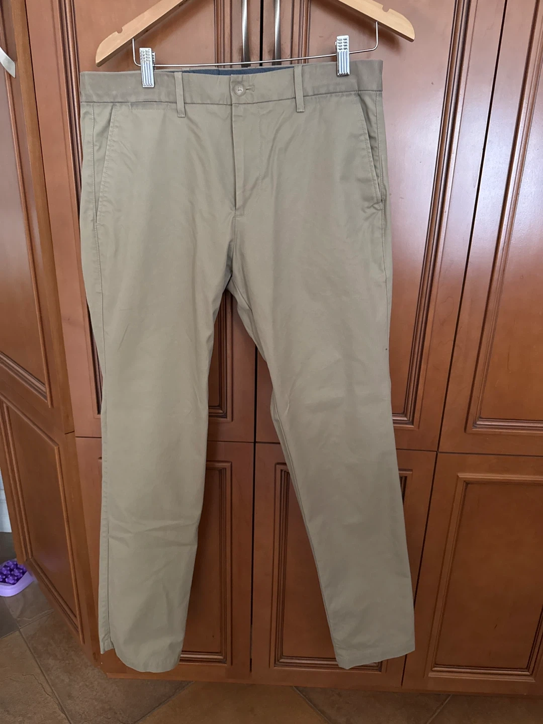 These are GAP slim fit chinos in a khaki colour. They're a size 33 waist by 32 inseam. Made in Sri Lanka.