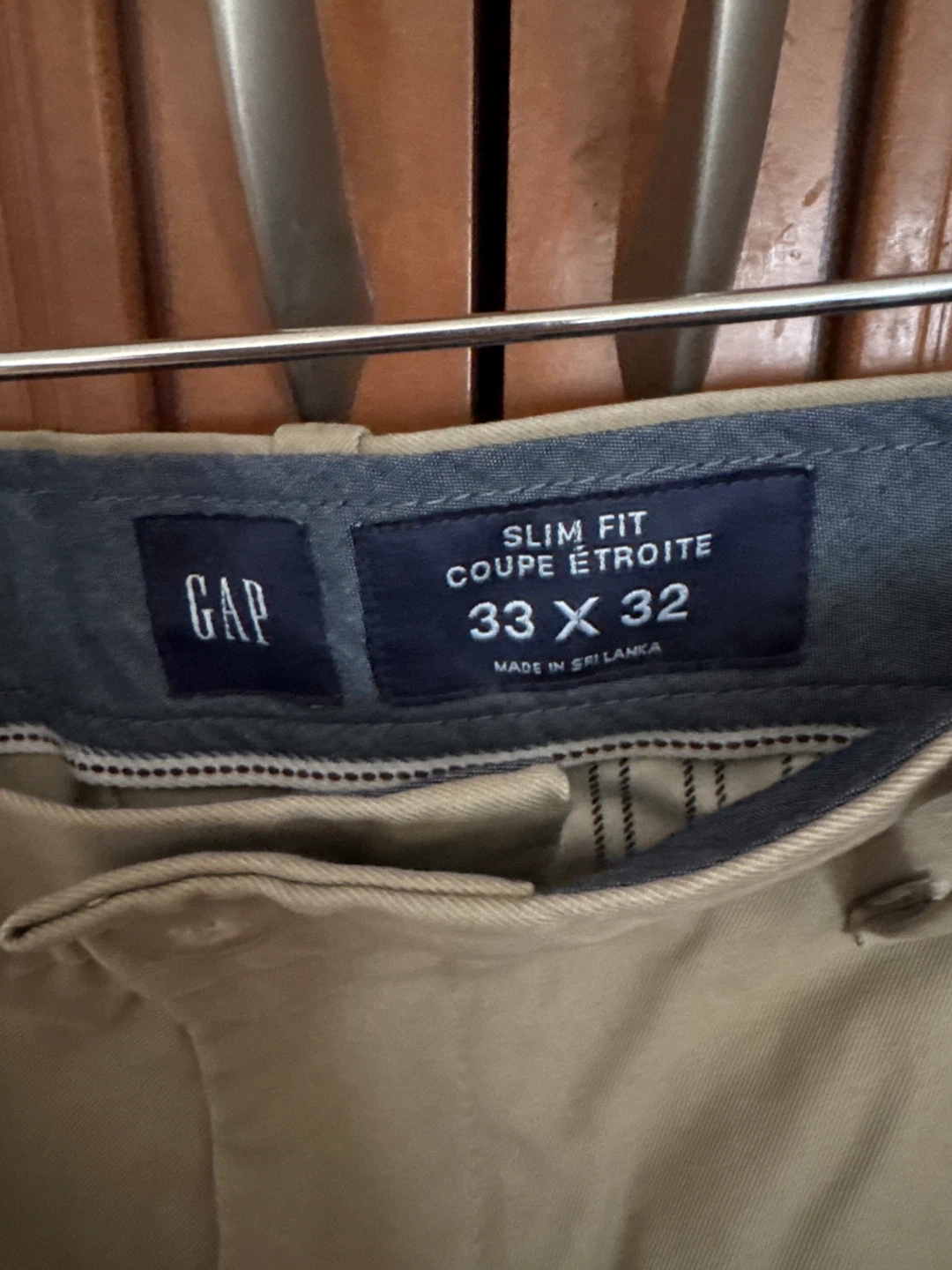 These are GAP slim fit chinos in a khaki colour. They're a size 33 waist by 32 inseam. Made in Sri Lanka.