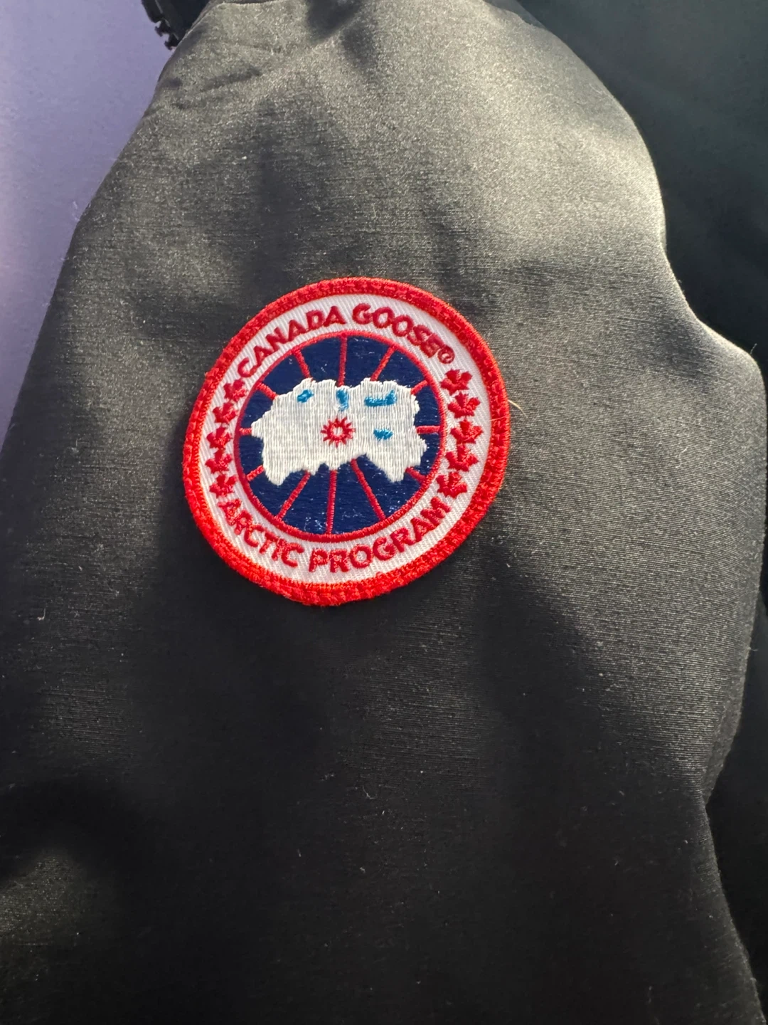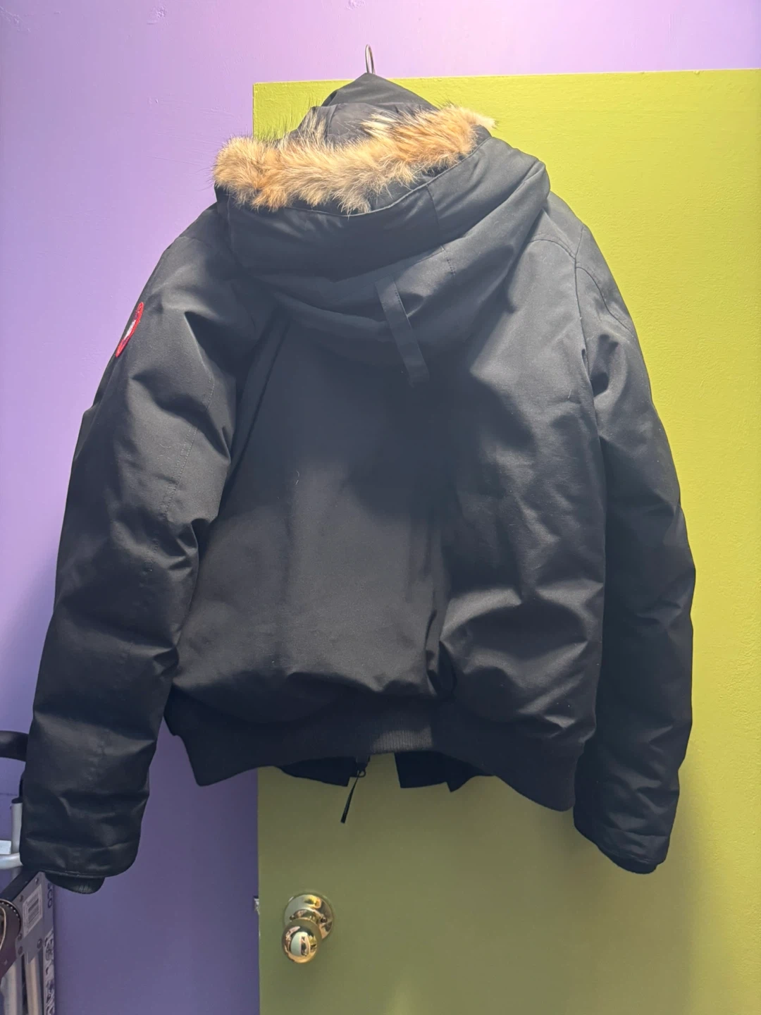 This is a black Canada Goose bomber jacket. Made in Canada. It's a warm winter jacket with a fur-lined hood.