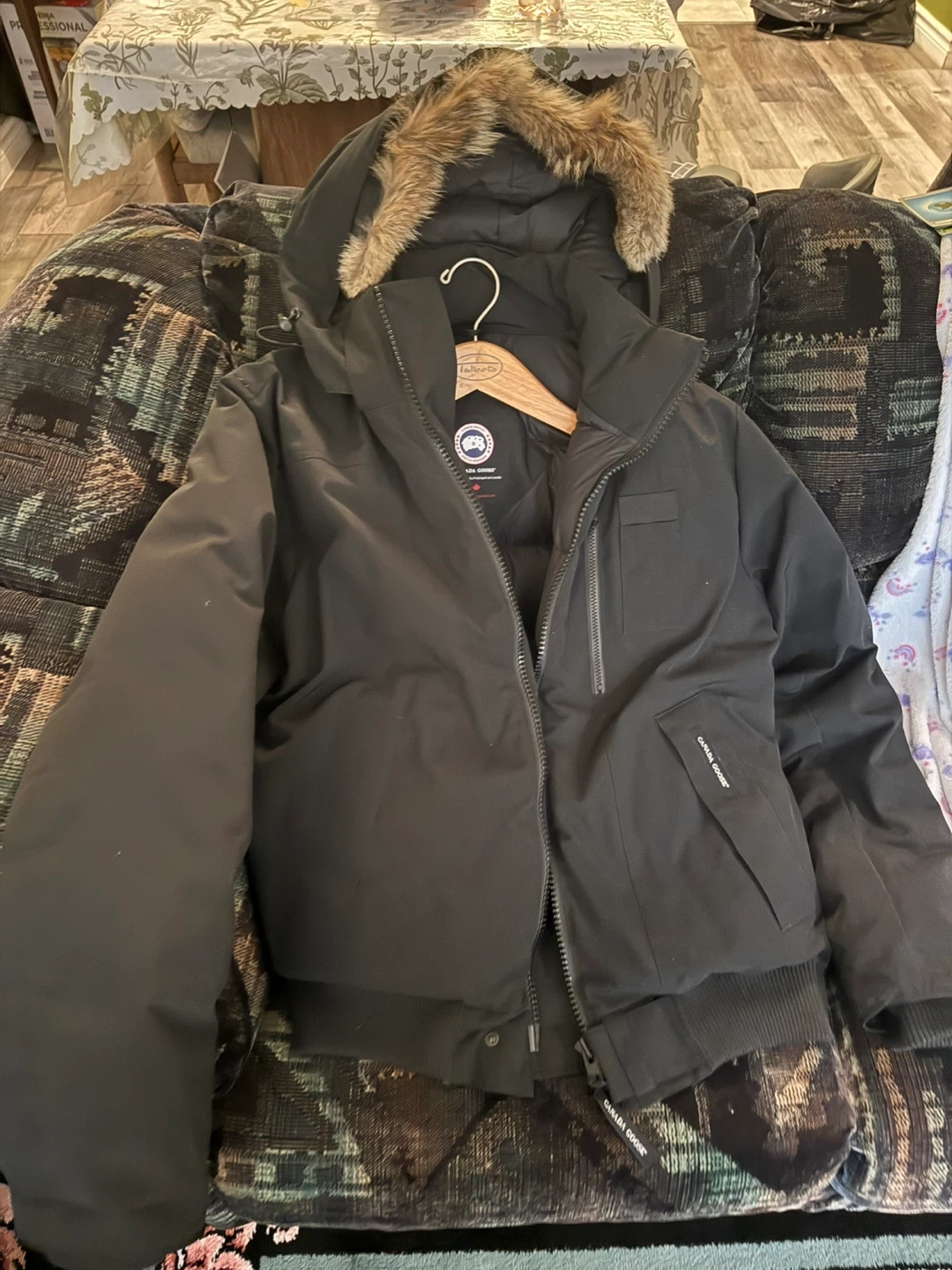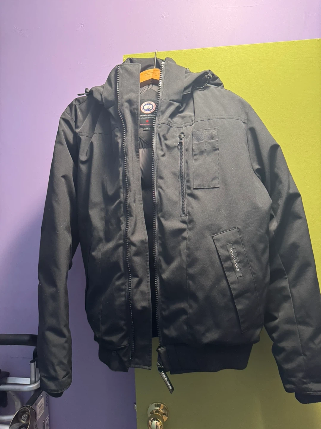 This is a black Canada Goose bomber jacket. Made in Canada. It's a warm winter jacket with a fur-lined hood.