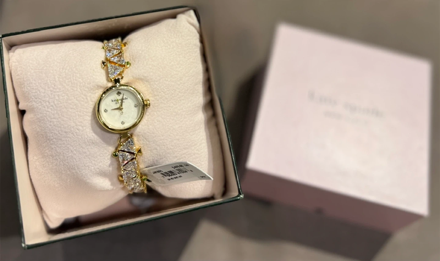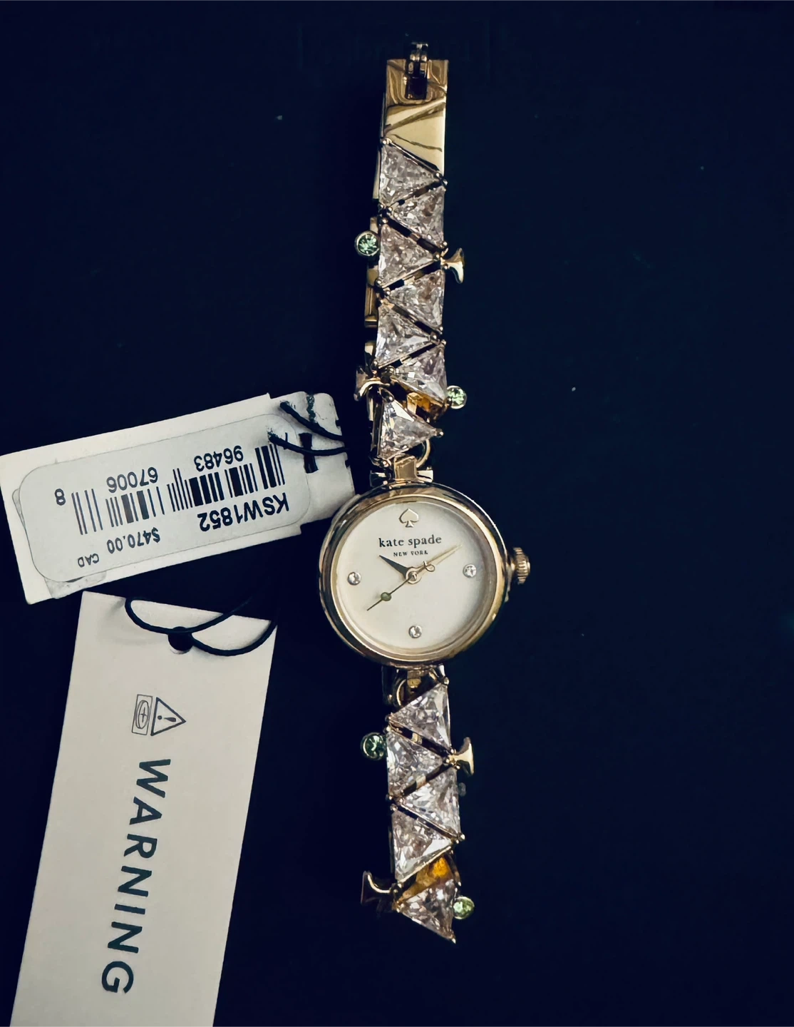 Beautiful gold-tone Kate Spade watch featuring a white dial and sparkling crystal accents on the band. It comes with its original box.