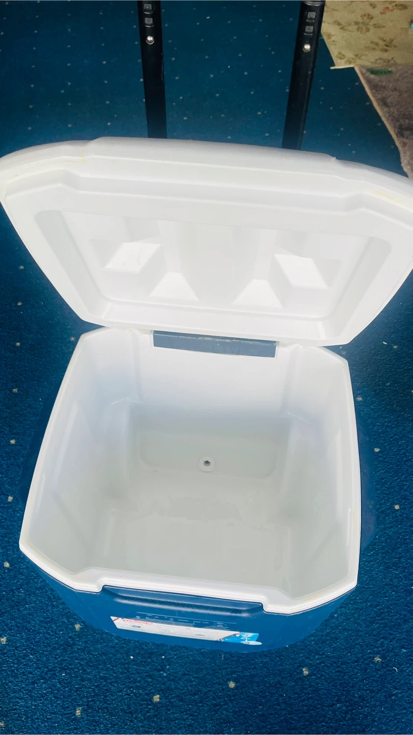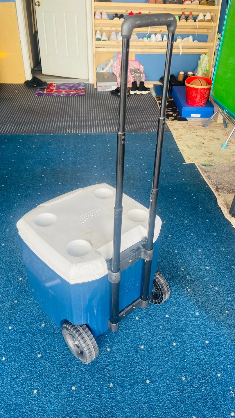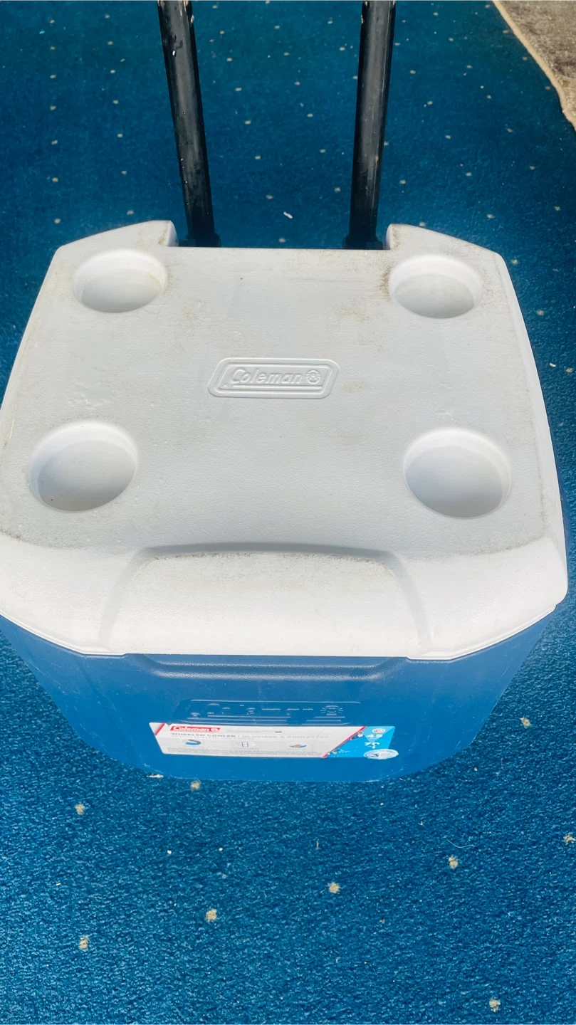 This is a Coleman rolling cooler. It's blue and white and has a retractable handle and wheels for easy transport. Features four cup holders on top. Great for camping trips or parties!