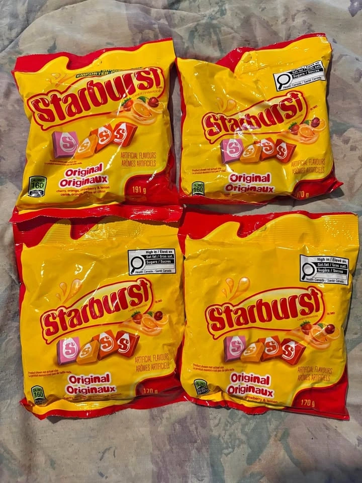 Sweet Starburst candy! Got 4 bags here. Price for all 4. Original flavors cherry, orange, strawberry, lemon. Three bags 170g each, one bag 191g. Best before June 2026. Good for snacking or sharing. Pickup only - Victoria drive & E 61 ave.
