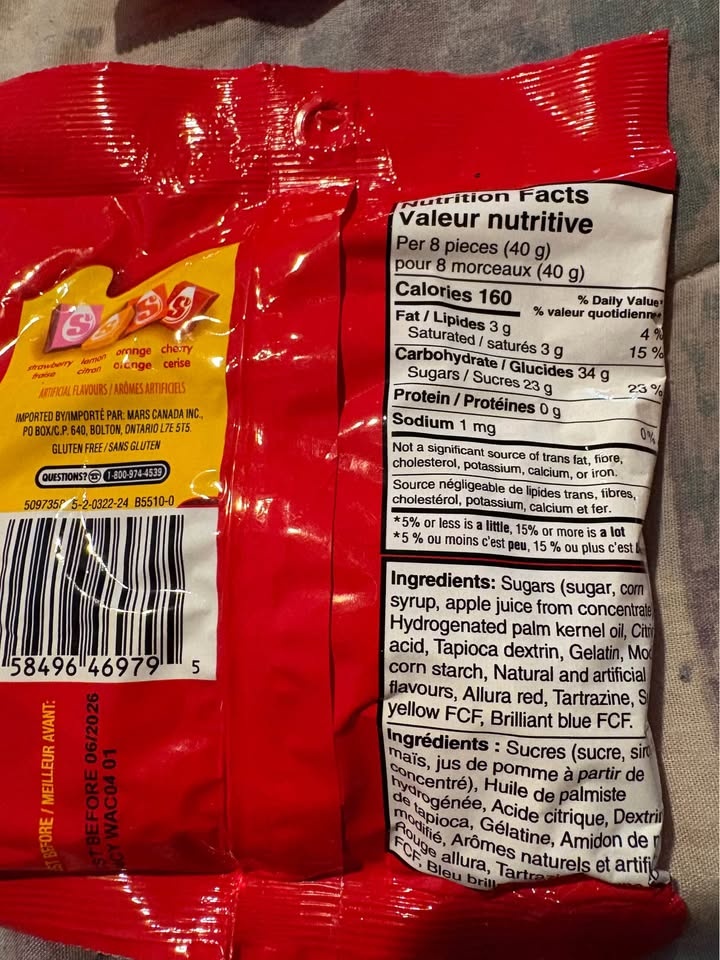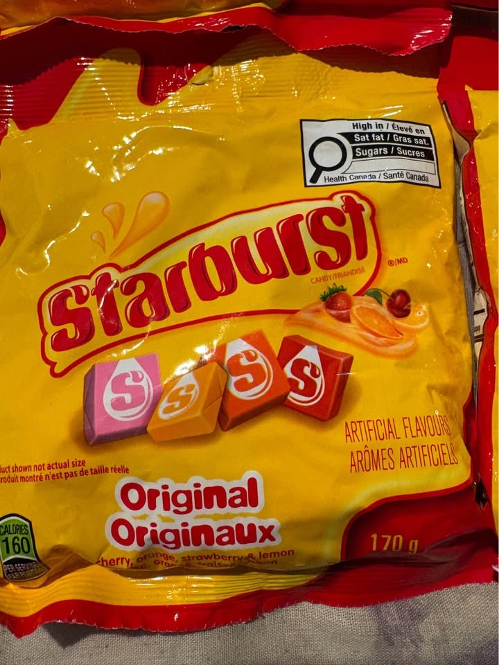 Sweet Starburst candy! Got 4 bags here. Price for all 4. Original flavors cherry, orange, strawberry, lemon. Three bags 170g each, one bag 191g. Best before June 2026. Good for snacking or sharing. Pickup only - Victoria drive & E 61 ave.