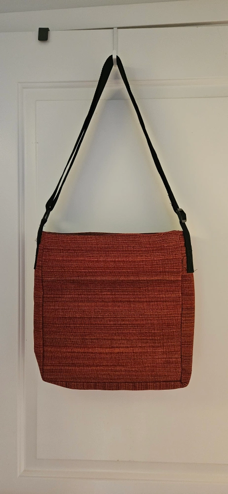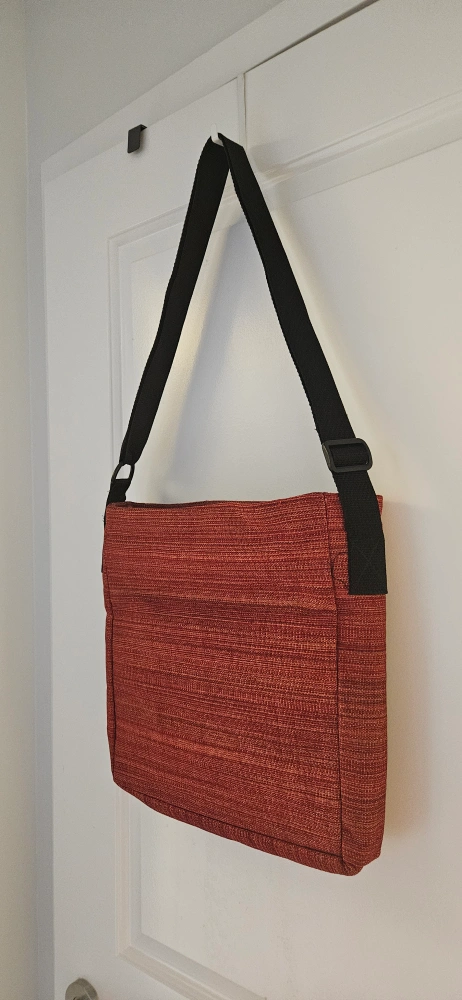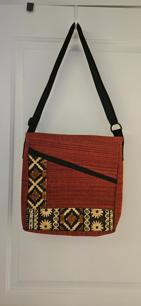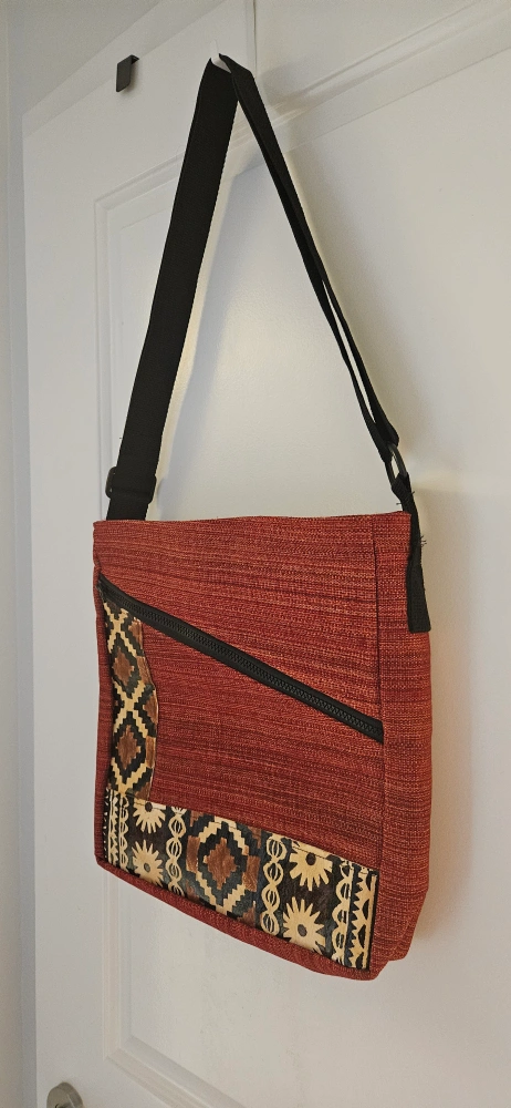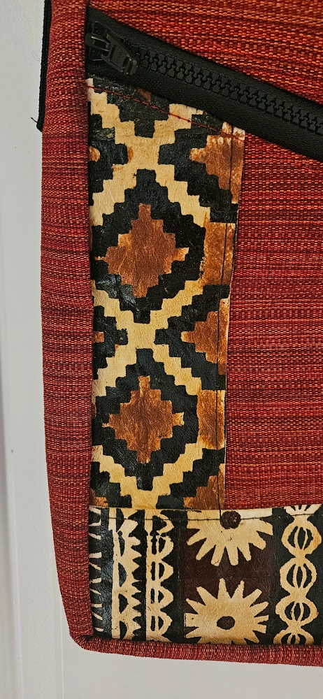 Here's a brand new stylish red shoulder bag /crossbody /laptop bag with a black strap! It features a unique design with geometric patterns and a convenient zipper. Purchased in Fiji. Perfect as a gift.