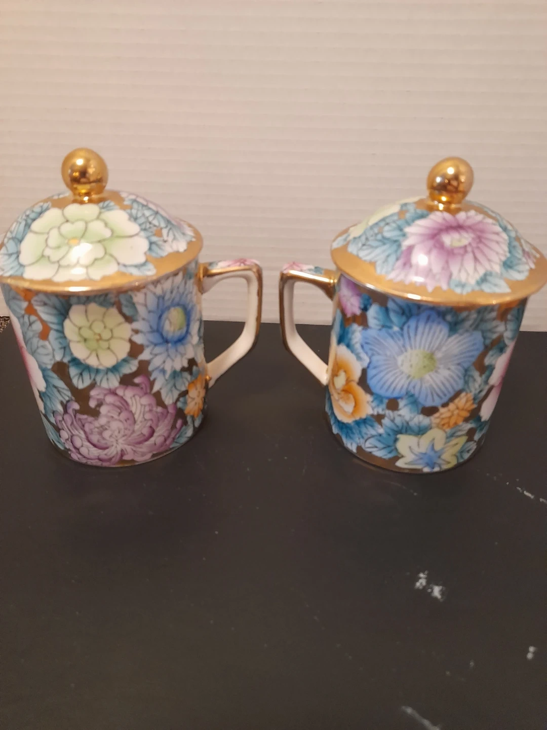 Selling a set of two floral tea cups, each with its own lid! They have a beautiful and intricate floral design with gold accents. Perfect for enjoying a cup of tea in style!
