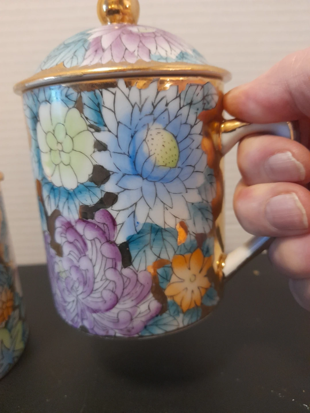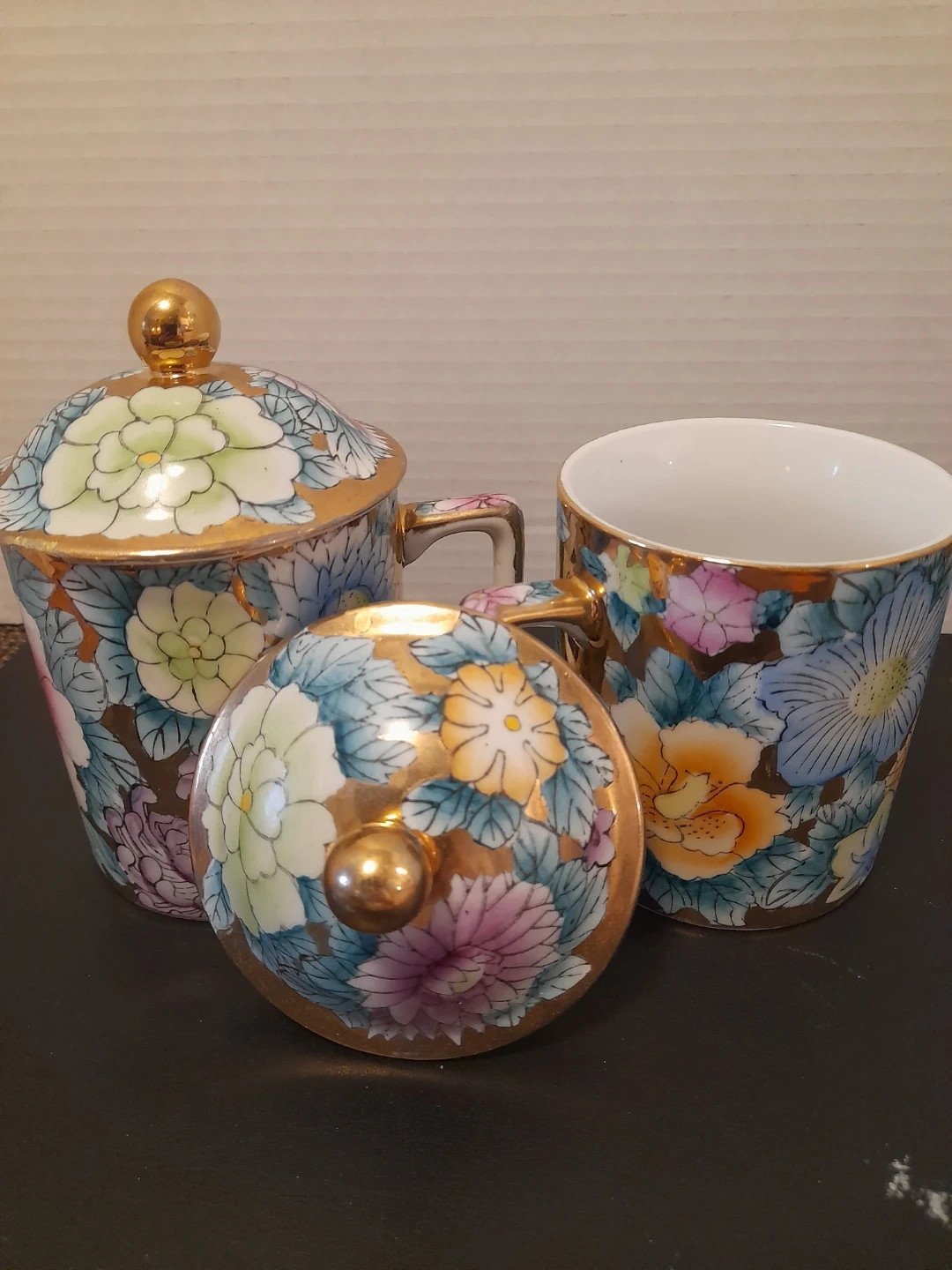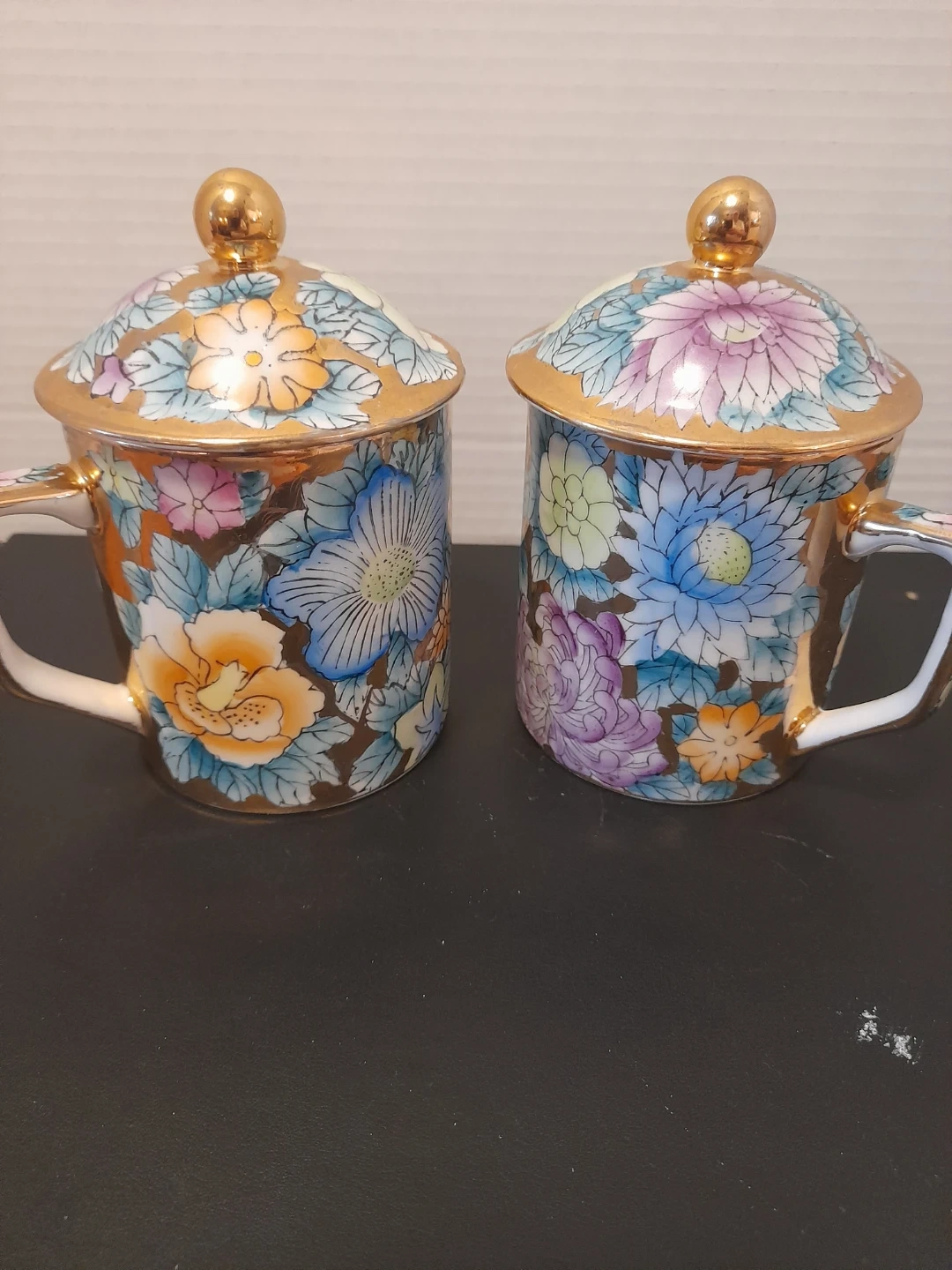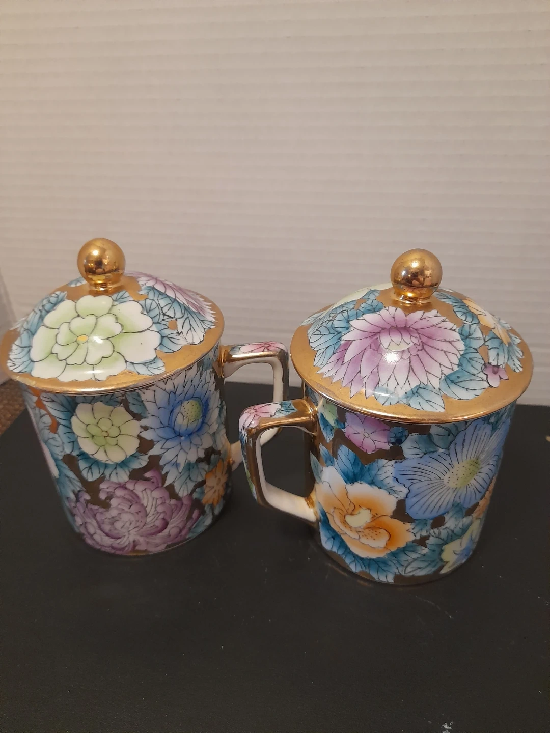 Selling a set of two floral tea cups, each with its own lid! They have a beautiful and intricate floral design with gold accents. Perfect for enjoying a cup of tea in style!