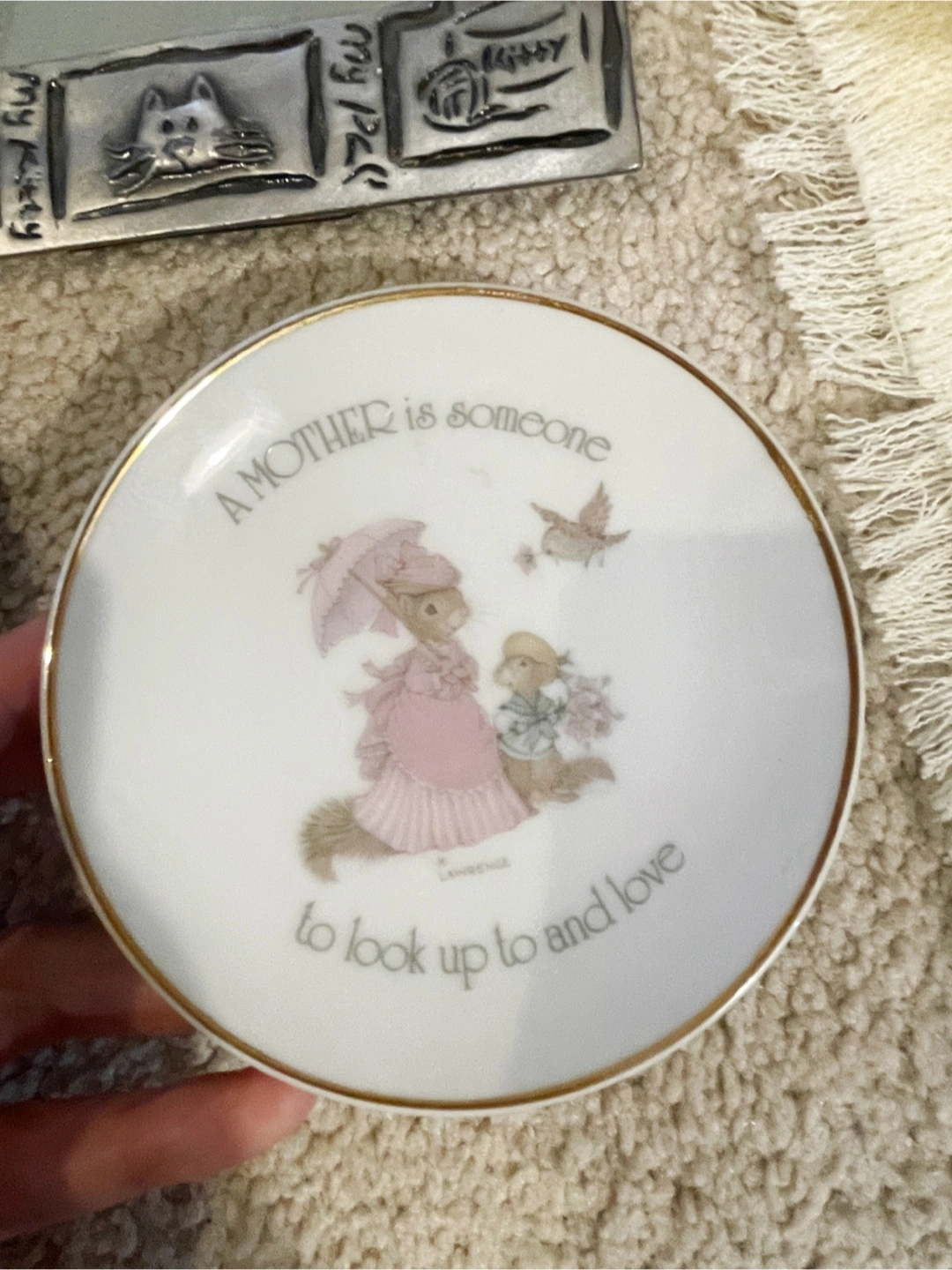 A sweet little plate featuring a mother and child bunny. It says, "A mother is someone to look up to and love" around the image. The plate has a gold rim.