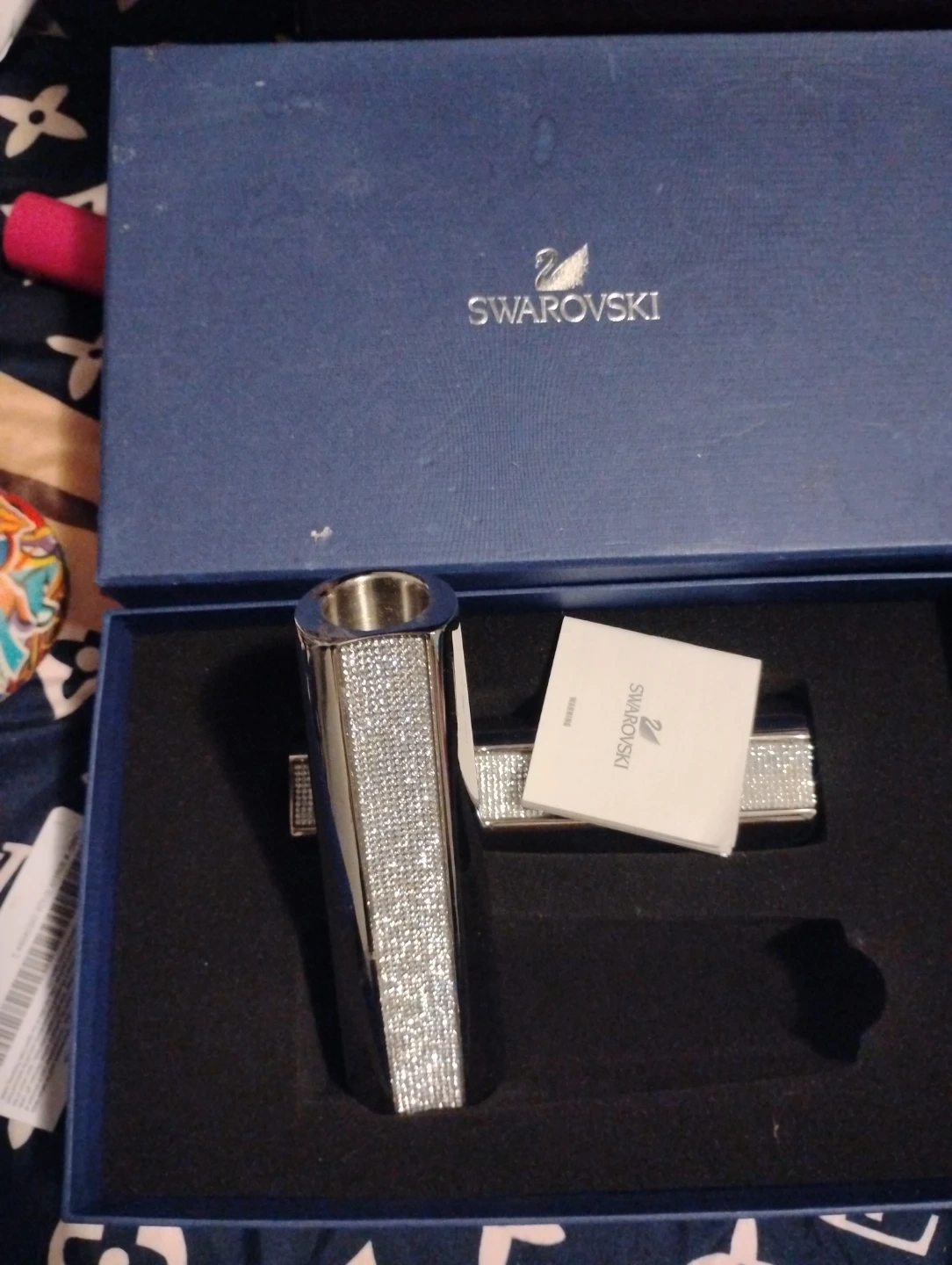 A beautiful set of two Swarovski crystal candle holders. They're encrusted with sparkling crystals for a luxurious look. Includes original box and authenticity booklet. Measures approx. 6 inches tall each.