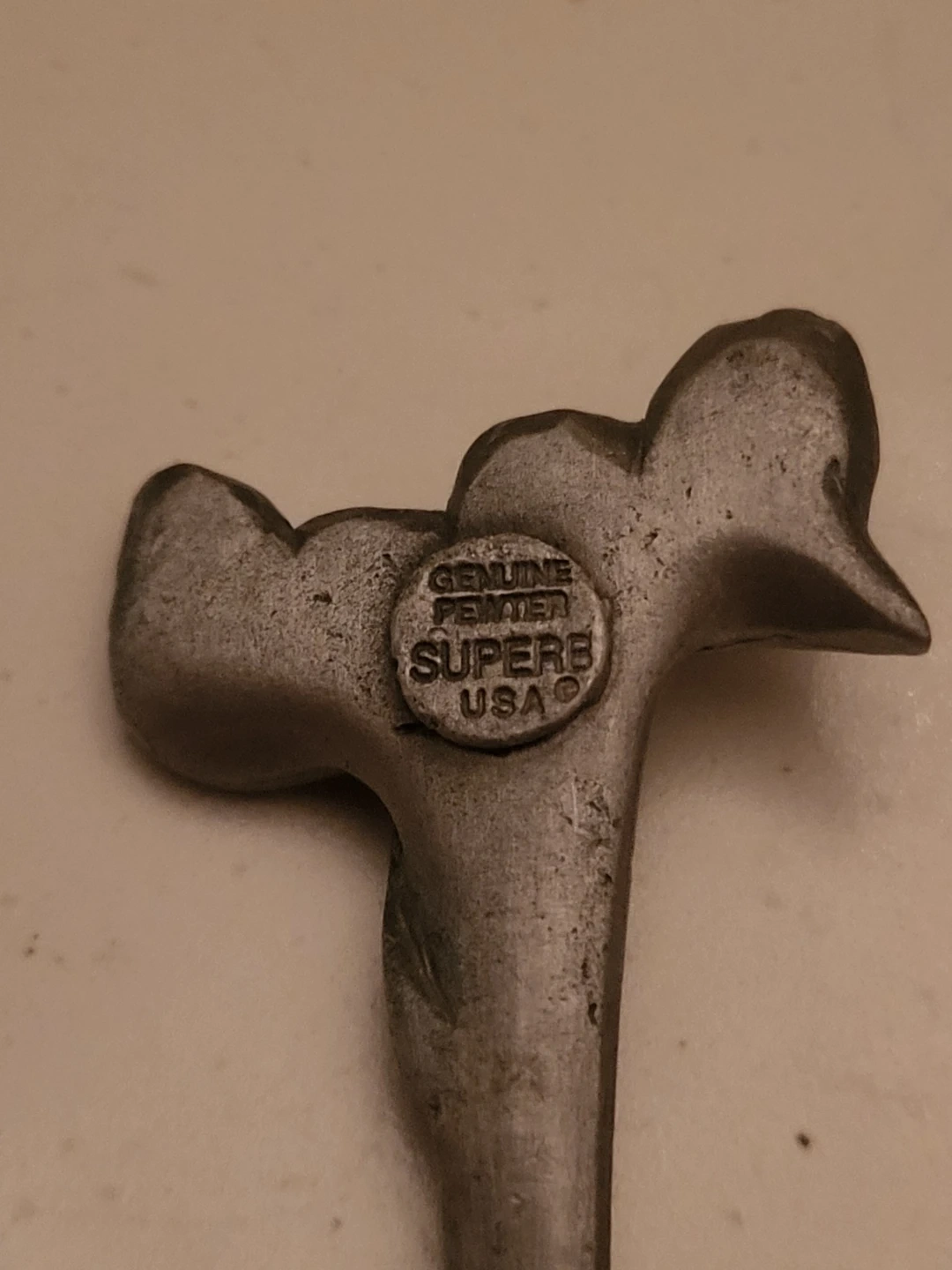 This unique spoon features the faces of Mount Rushmore carved into the handle, with 'MOUNT RUSHMORE' inscribed vertically. The spoon bowl shows a relief of a bison. It's made of genuine pewter in the USA by Superb. A neat collectible for any souvenir enthusiast!