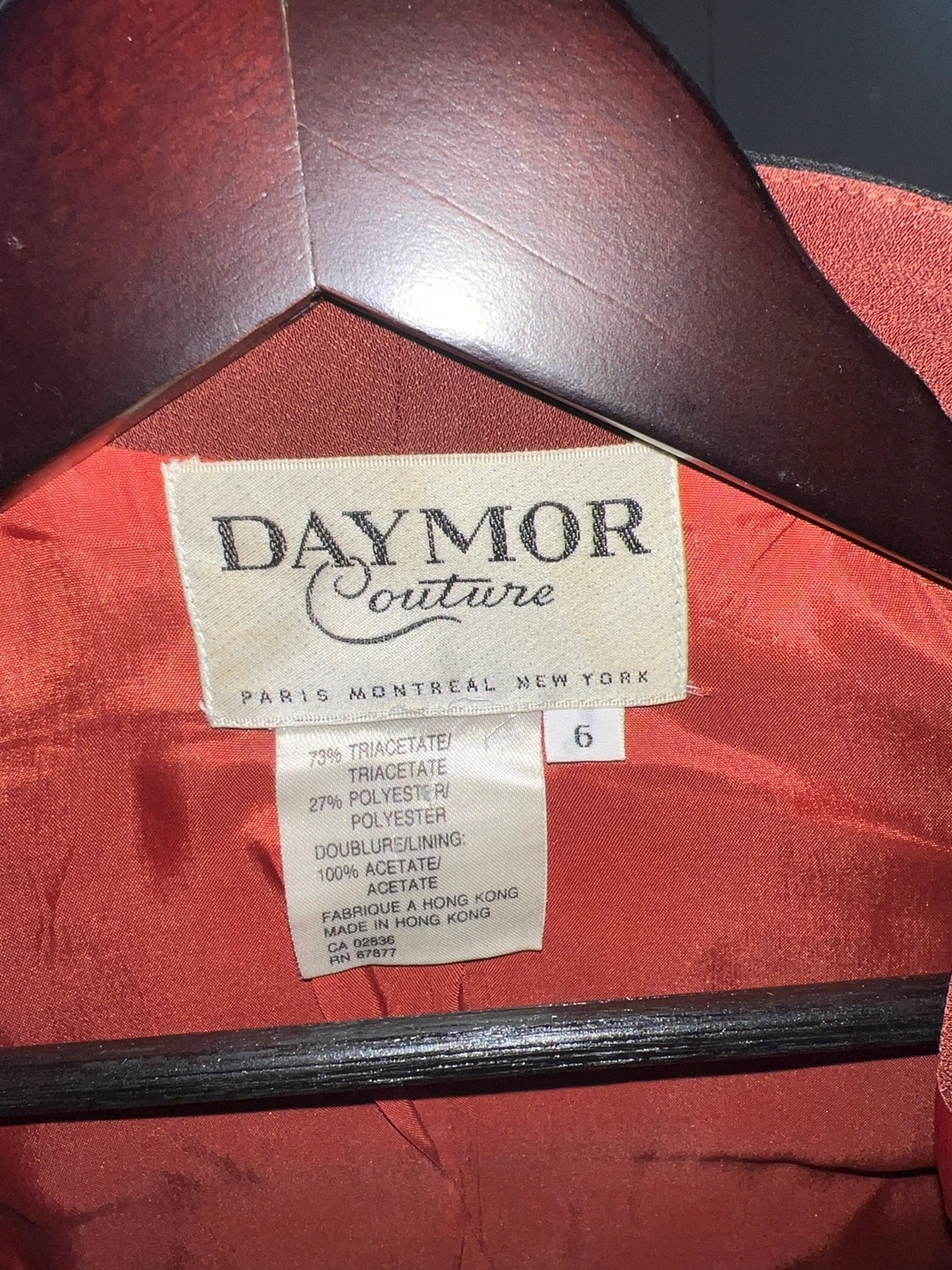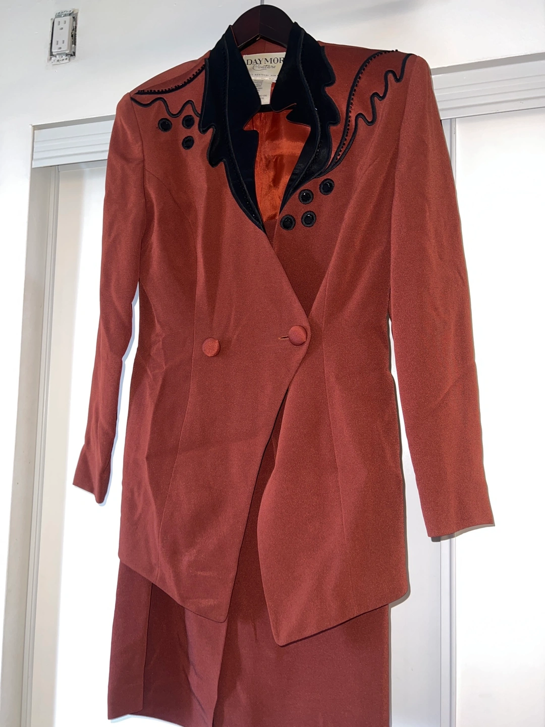 A size 6 suit by Daymor Couture in a rust colour. The suit has a black velvet collar and detailed trim on the jacket. The jacket has a single button closure at the front and a double button closure on the cuffs. The skirt has a straight cut.