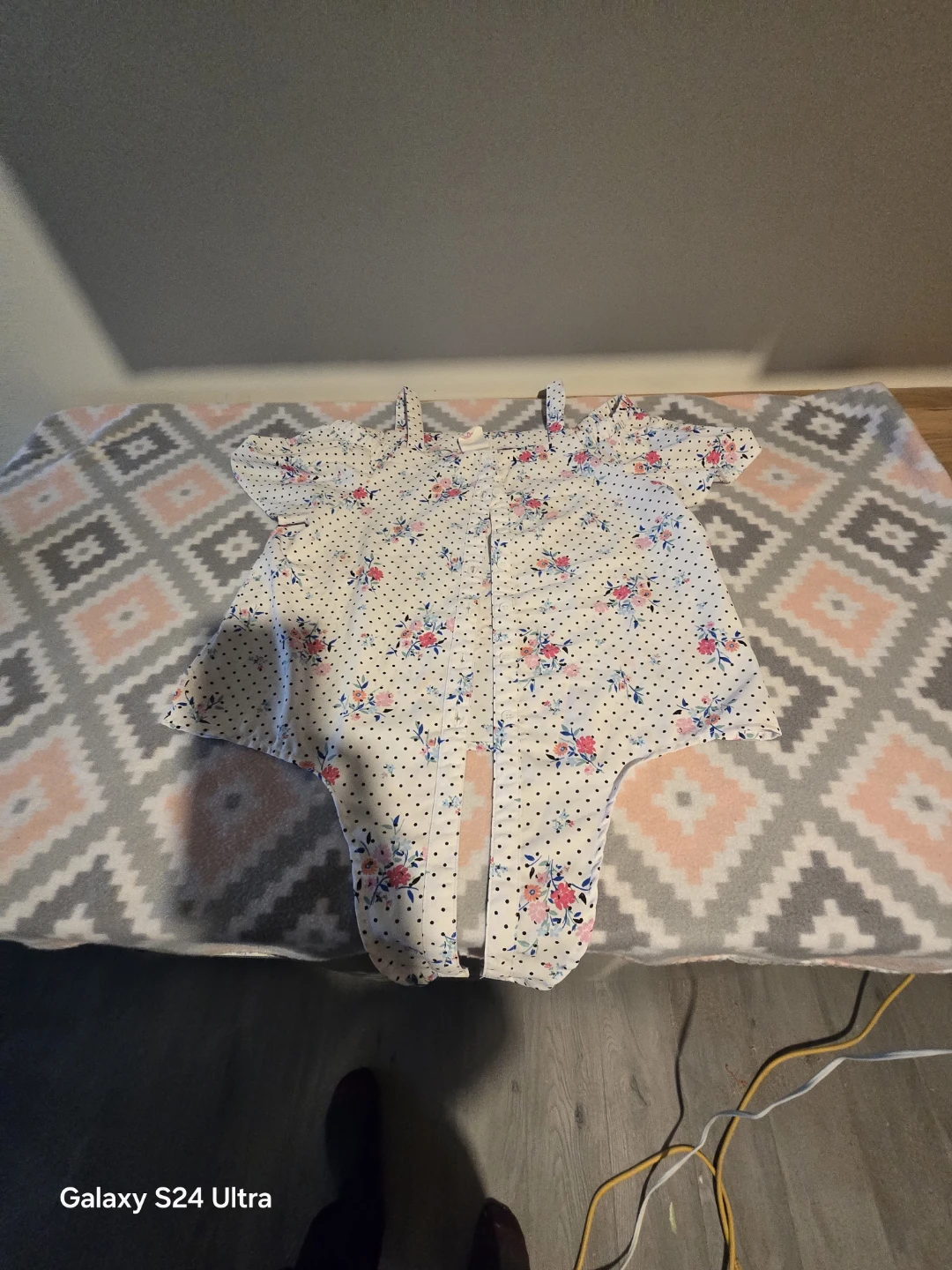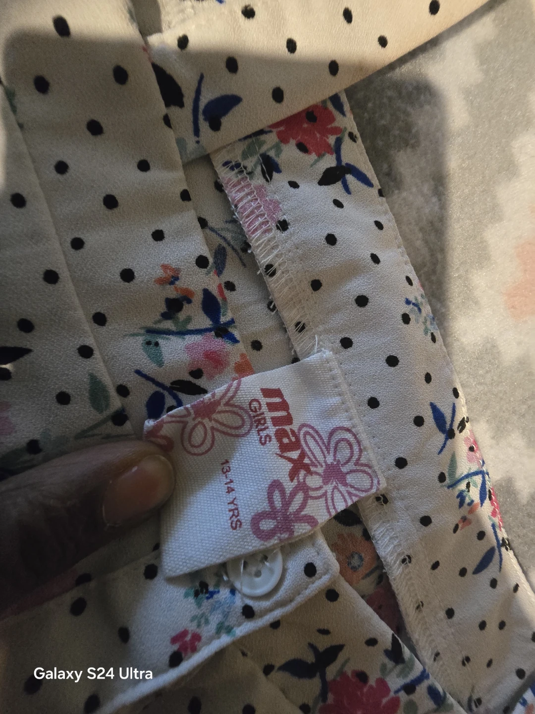 This is a cute floral dress from Max Girls! It's sized for 13-14 year olds and features a lovely floral pattern with polka dots. Perfect for a young girl's wardrobe!