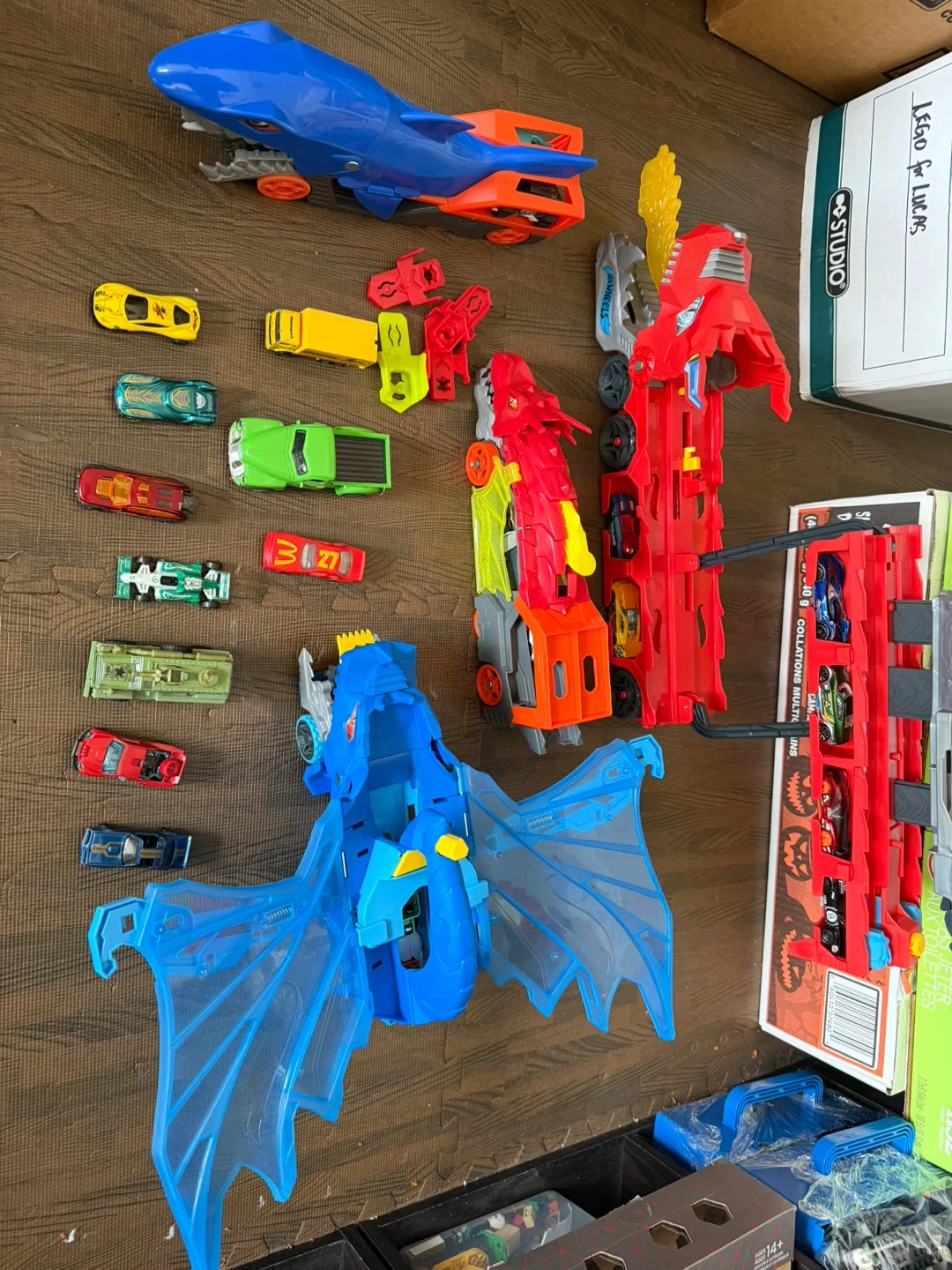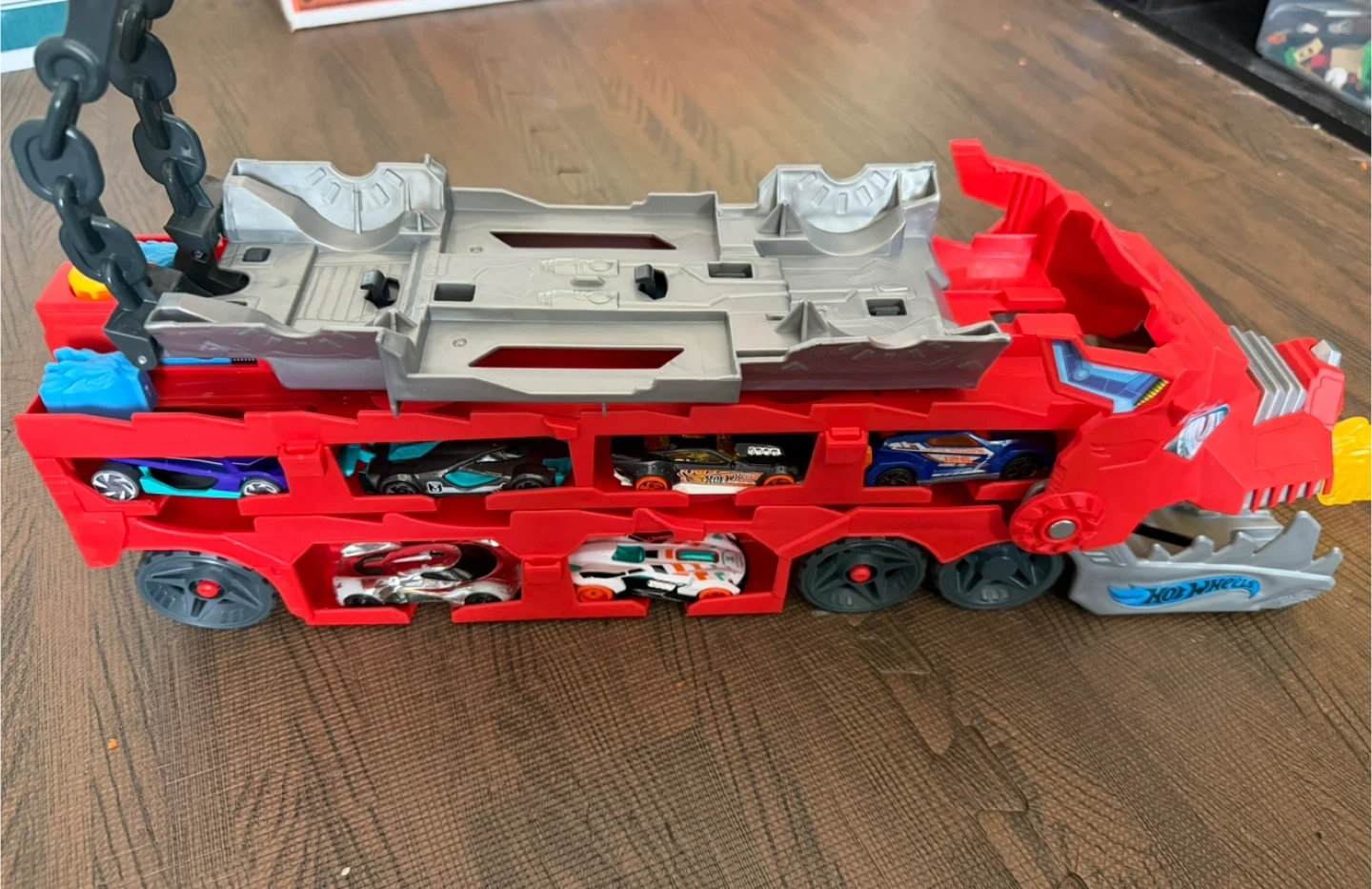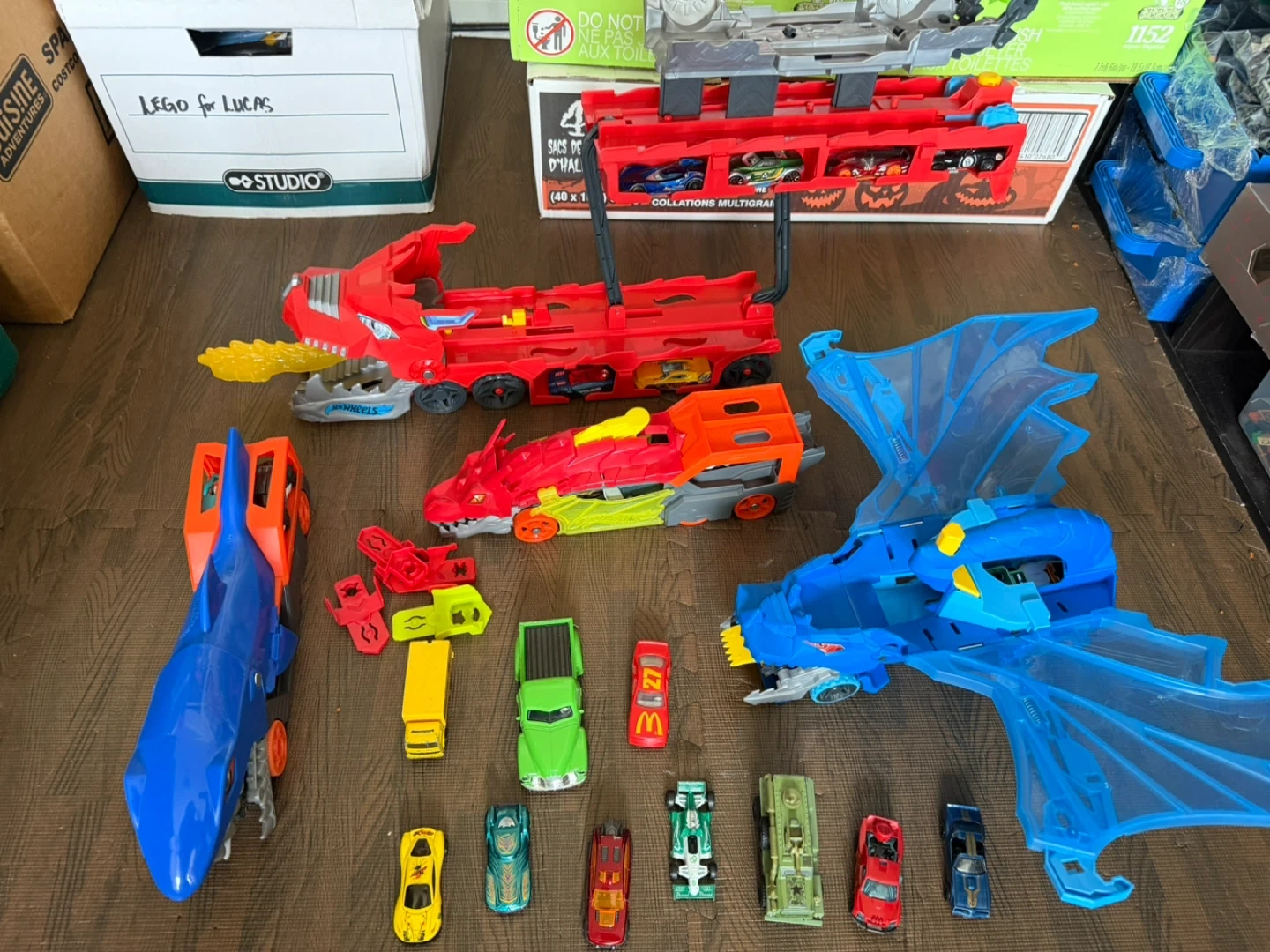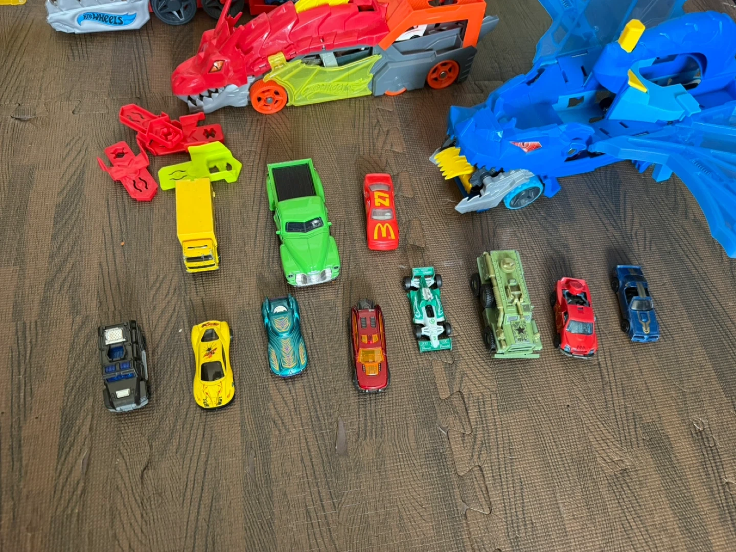 This set includes a Hot Wheels Dragon Hauler toy truck and several assorted Hot Wheels cars. It's a great collection for any young car enthusiast! Still in great condition! Pick up only. North York.
