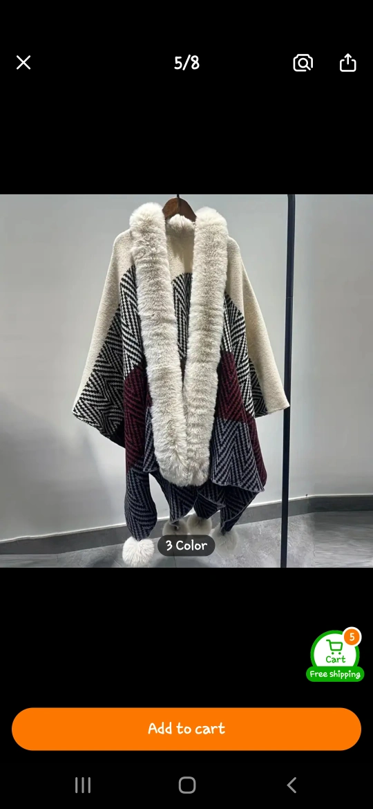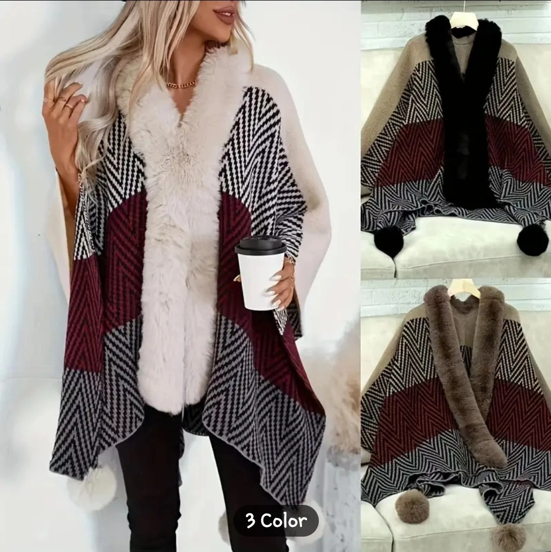 Stylish poncho featuring a faux fur collar and a chevron pattern. Three colour block design. Pom-poms at the hem. Perfect for fall and winter.