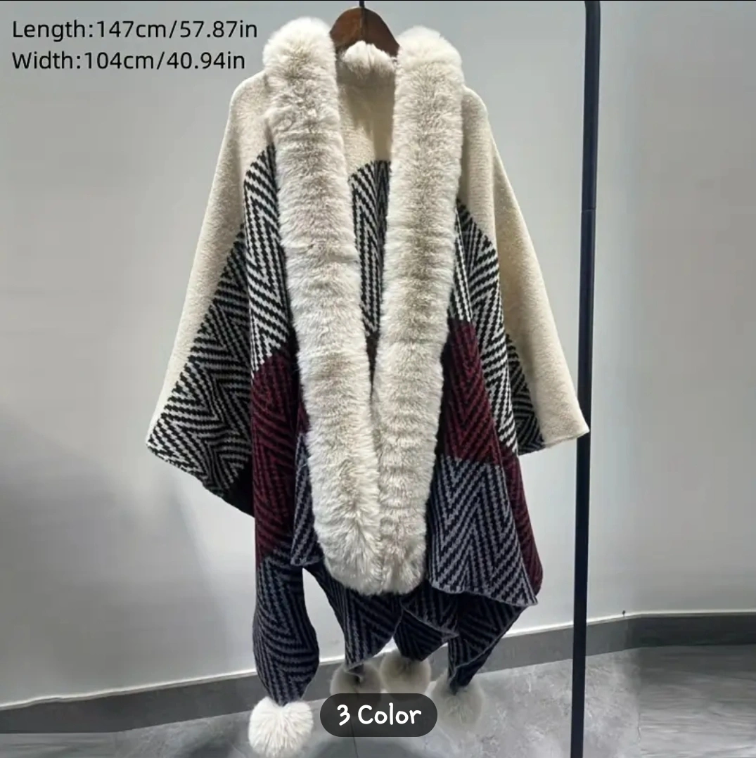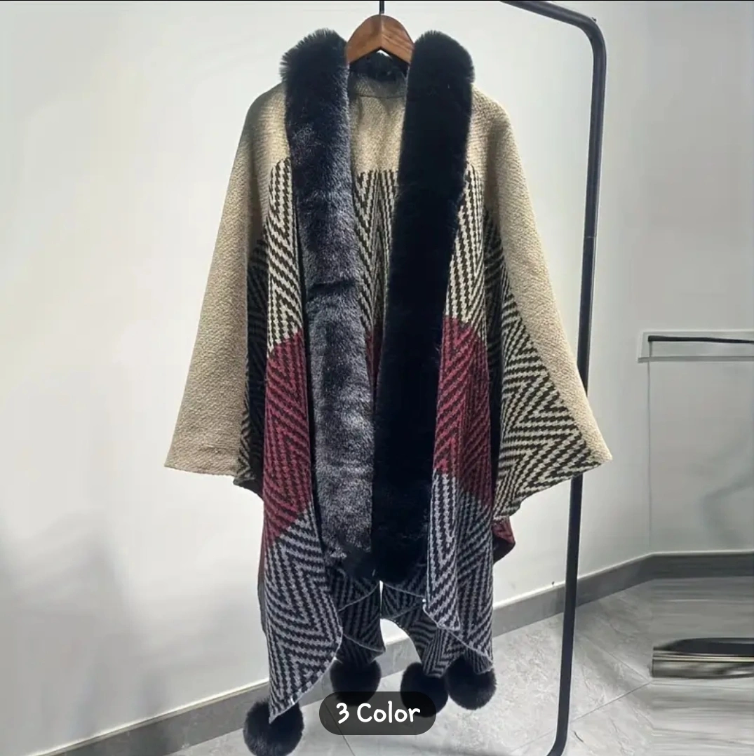 Stylish poncho featuring a faux fur collar and a chevron pattern. Three colour block design. Pom-poms at the hem. Perfect for fall and winter.
