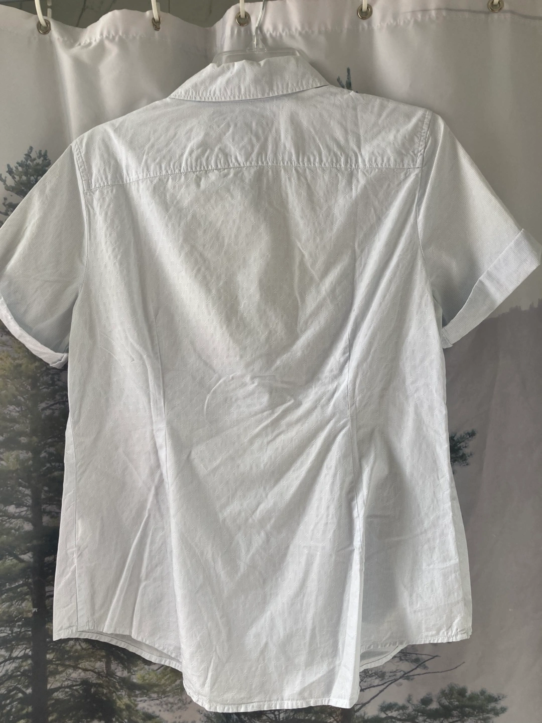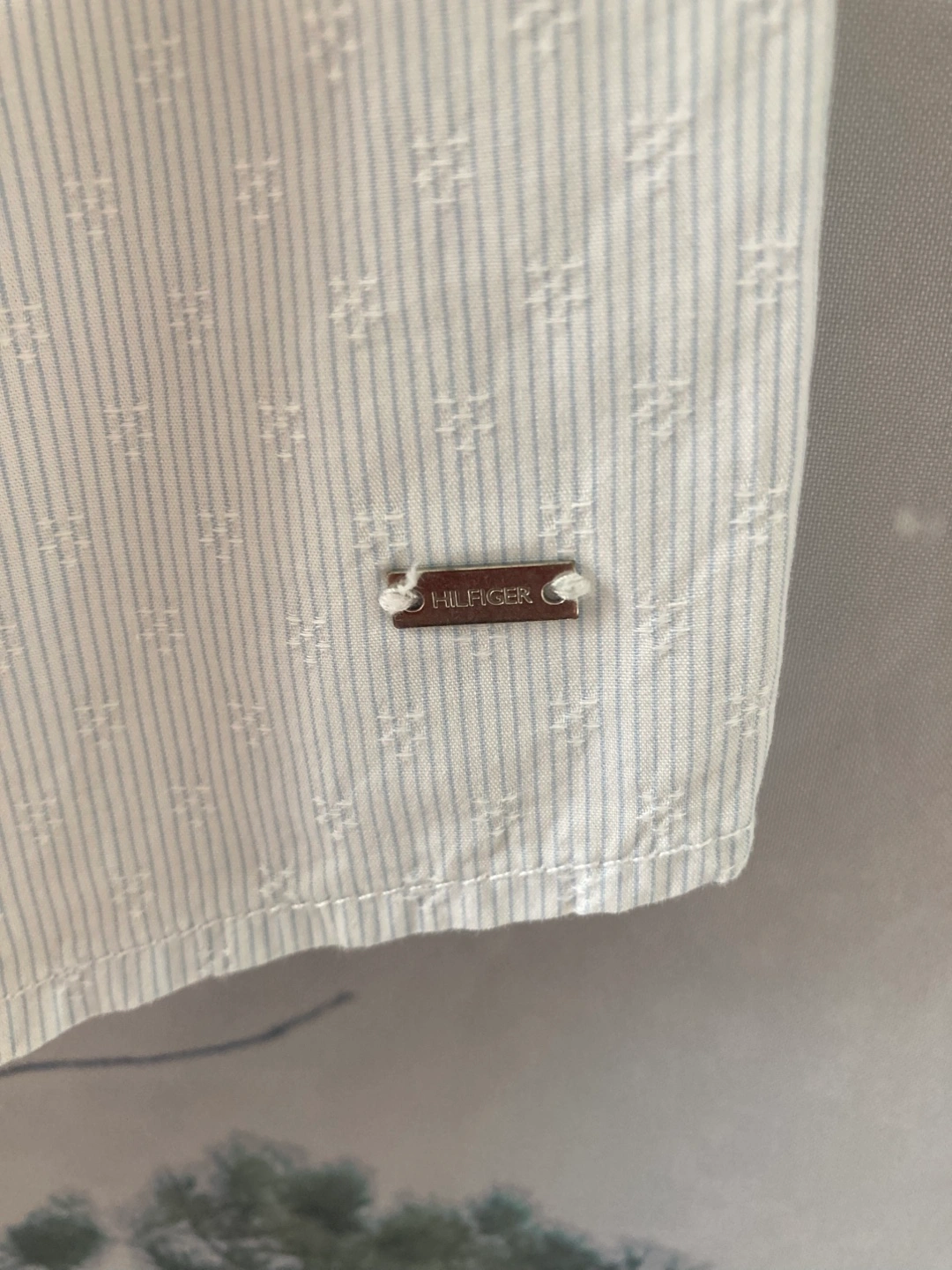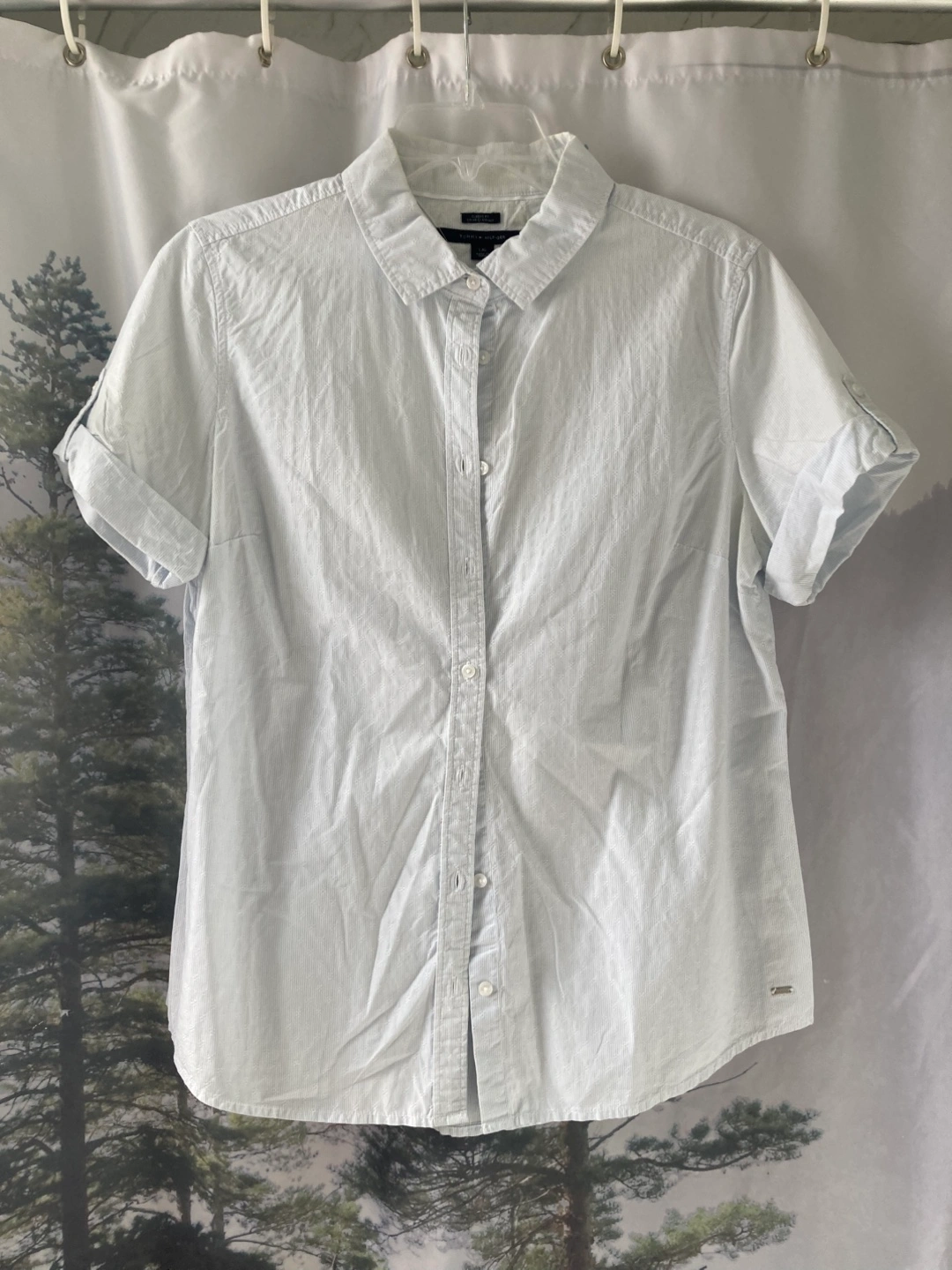 Tommy Hilfiger classic fit shirt in size large! It's a light blue and white striped button-up with short sleeves. Great for a casual or semi-formal look. Great with jeans or a summer skirt.