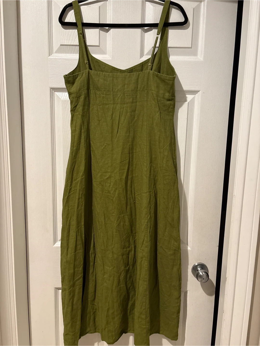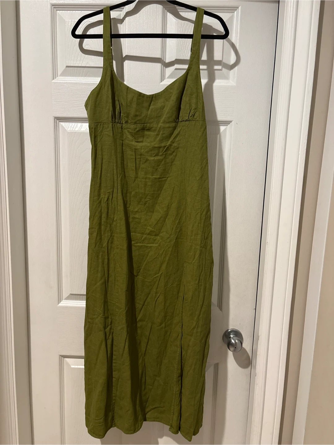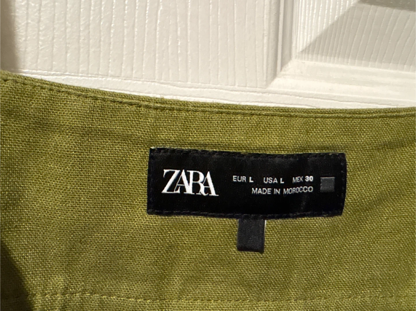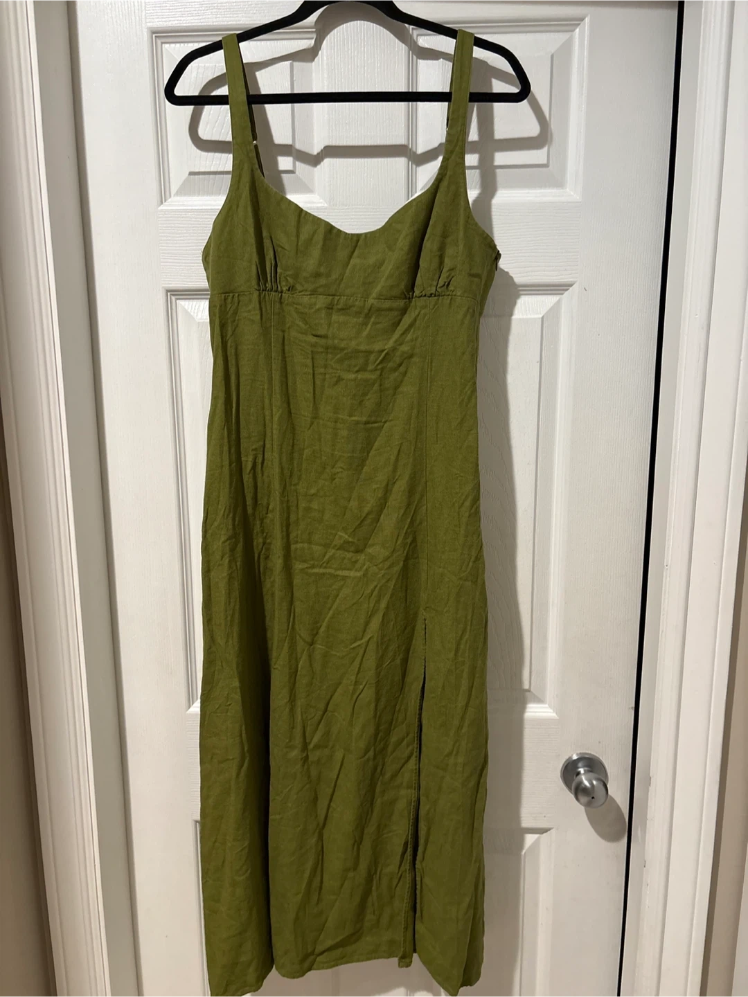 This ZARA midi dress is a size large and made in Morocco. It's a lovely olive green colour and features a linen blend fabric with two side slits for easy movement. It's perfect for warm weather occasions!