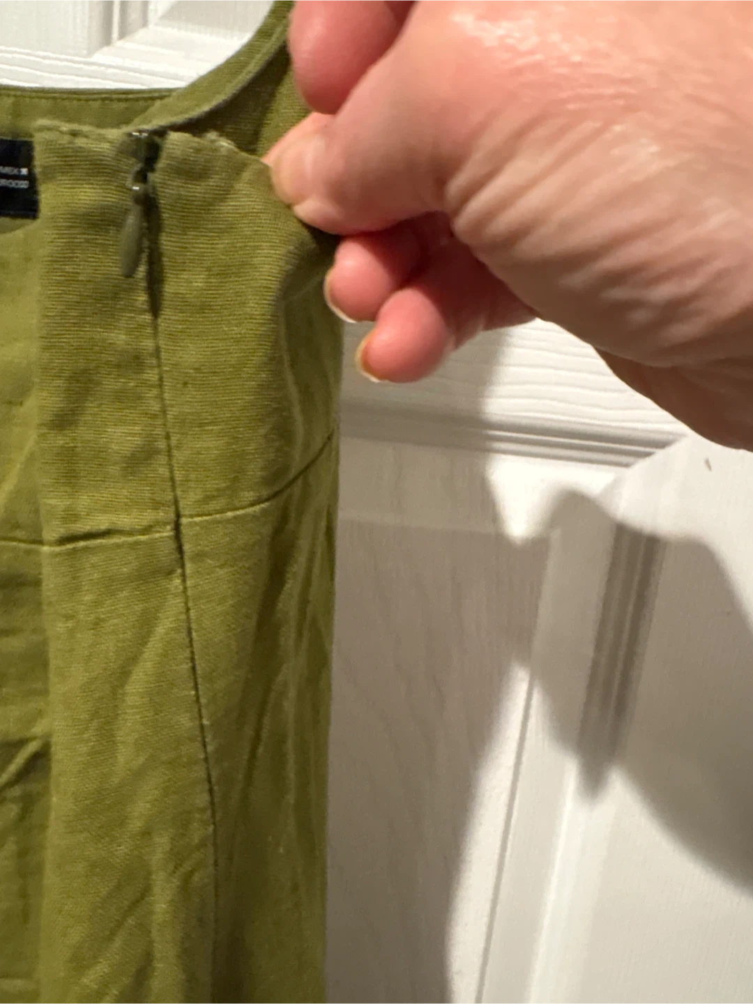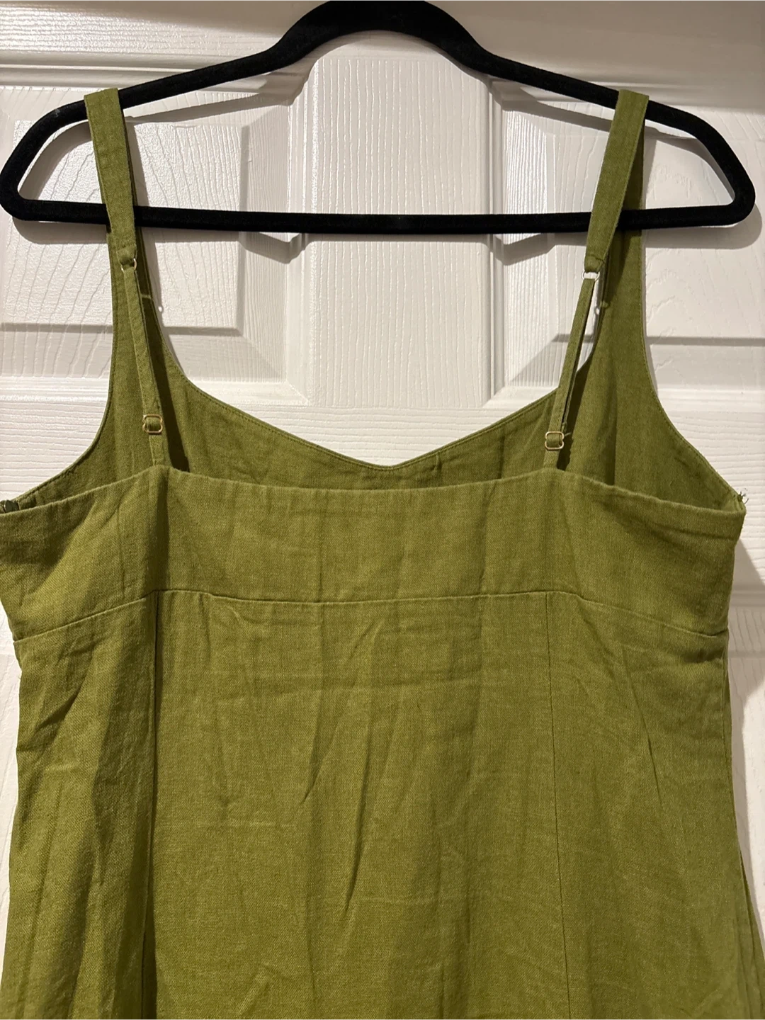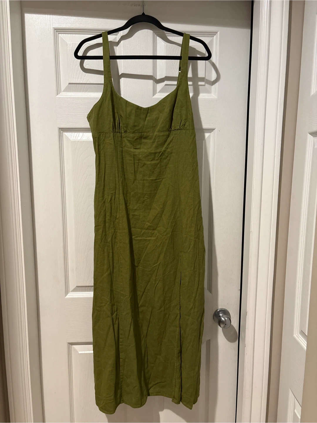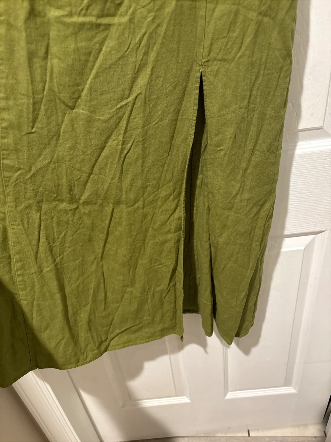 This ZARA midi dress is a size large and made in Morocco. It's a lovely olive green colour and features a linen blend fabric with two side slits for easy movement. It's perfect for warm weather occasions!