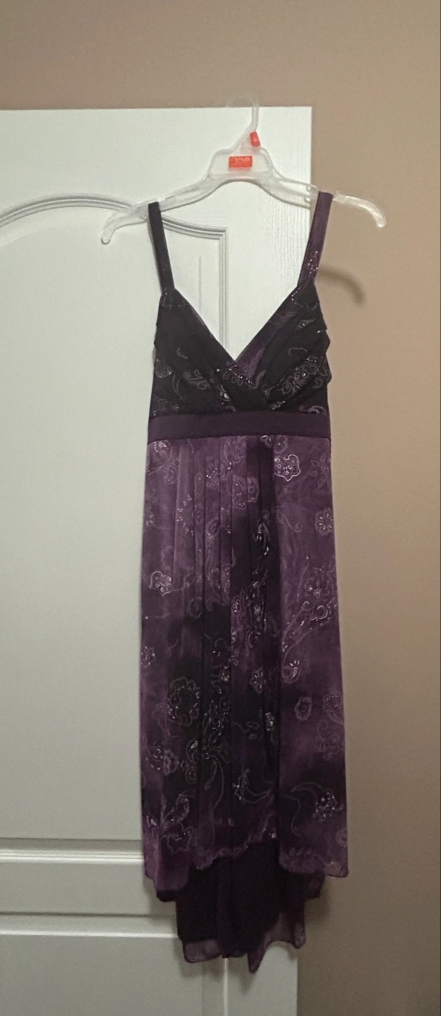 12Beautiful purple dress. Features a sequined bodice and a flowing chiffon skirt. High-low hemline. Sleeveless, v-neckline.