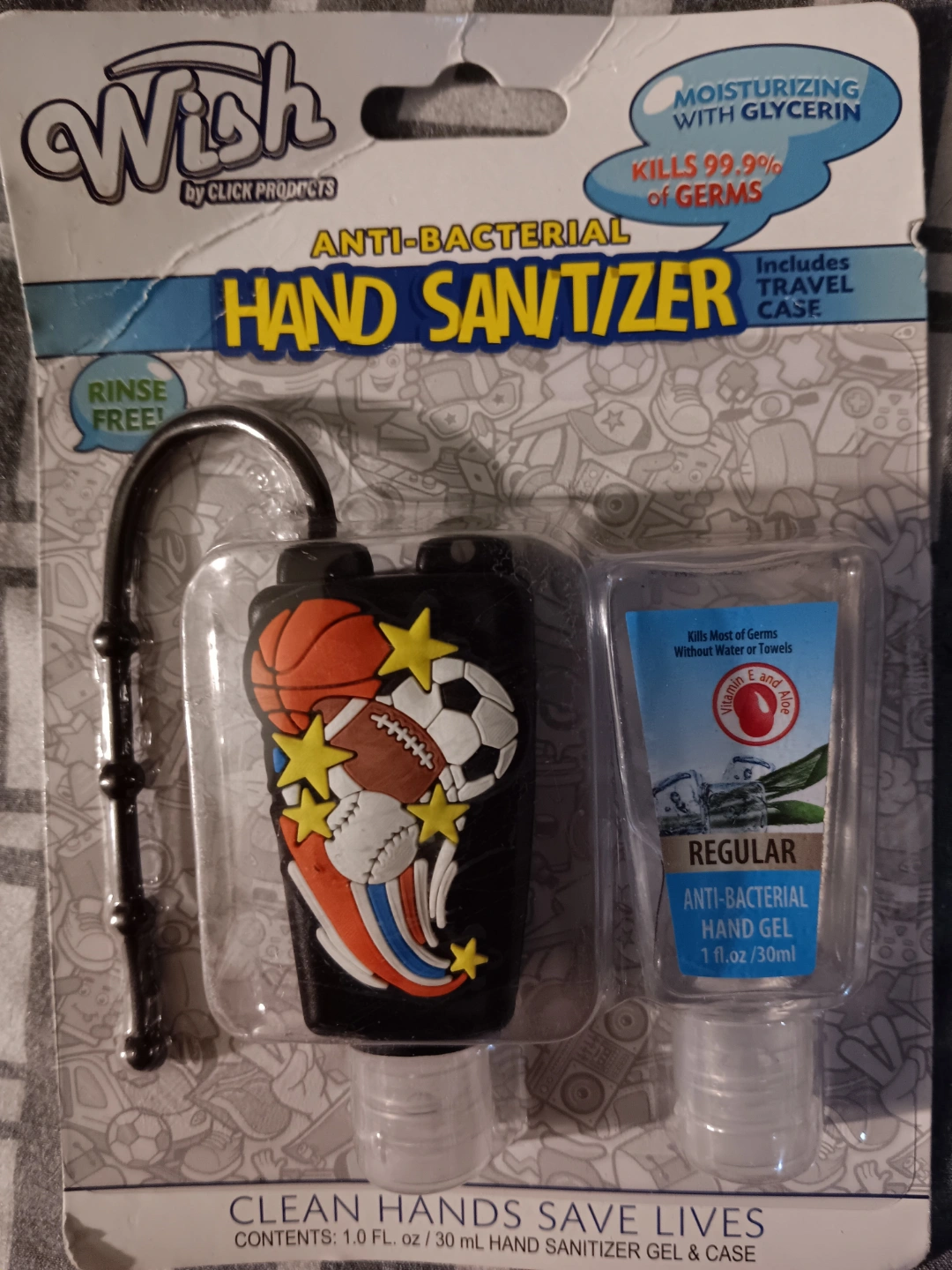 Anti-bacterial hand sanitizer. Includes travel case. Moisturizing with glycerin. Kills 99.9% of germs. Rinse free. Sports theme.