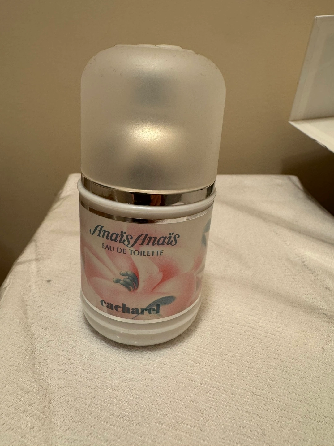 Vintage perfume bottle. Frosted glass top. White and pink label. Eau de Toilette.
