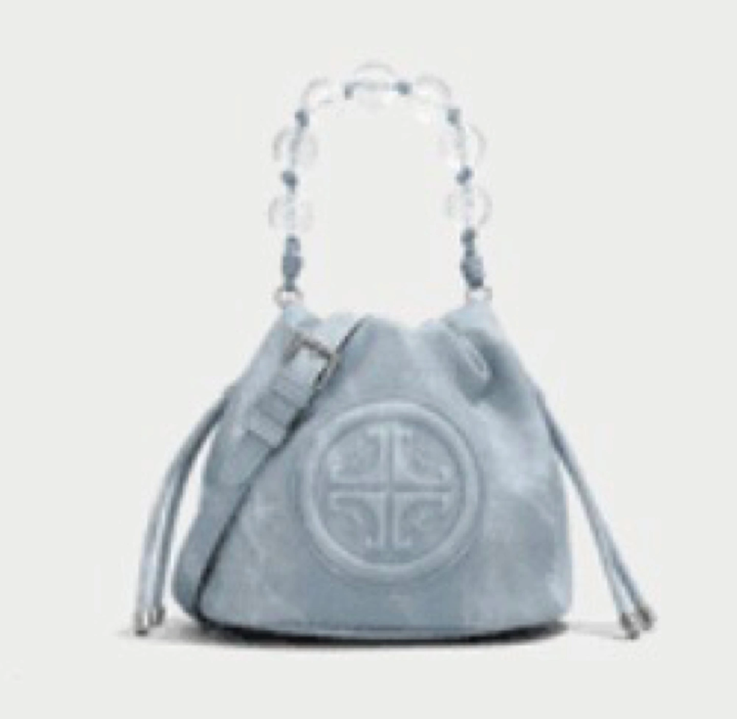 Adorable bucket bag. Features a light blue denim-like material. Unique beaded strap. Drawstring closure. Small crossbody bag.