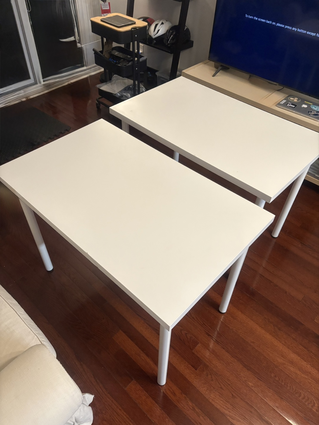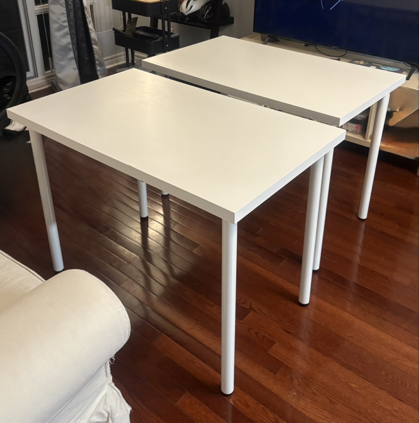 Two white IKEA LINNMON/ADILS tables. Some scratches showed in the photos. Great for a home office or small space. Dimensions: 100x60x64 cm. Meet and Pick up. No dismantle.