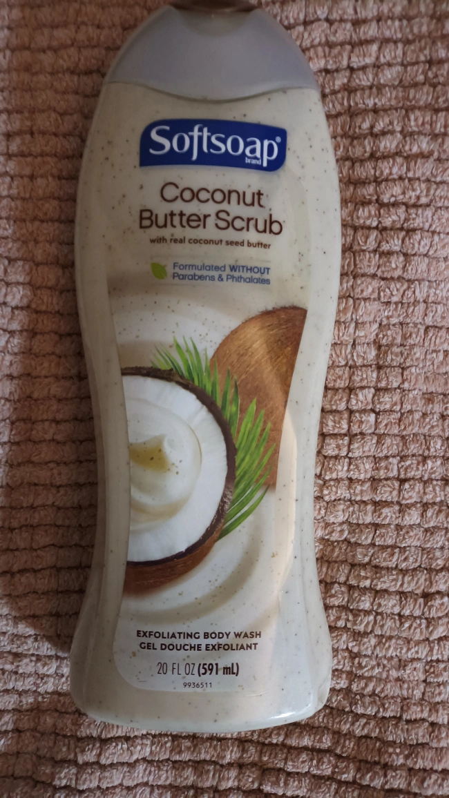 1000+Exfoliating body wash. Coconut scent. 20 fl oz (591 mL). Formulated without parabens & phthalates.