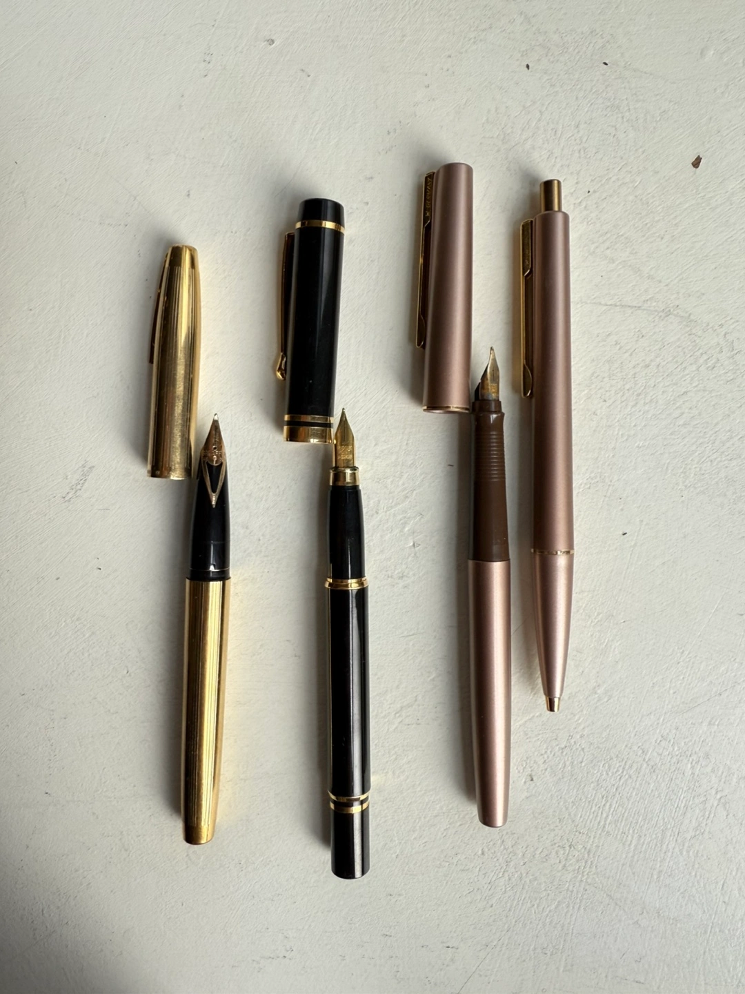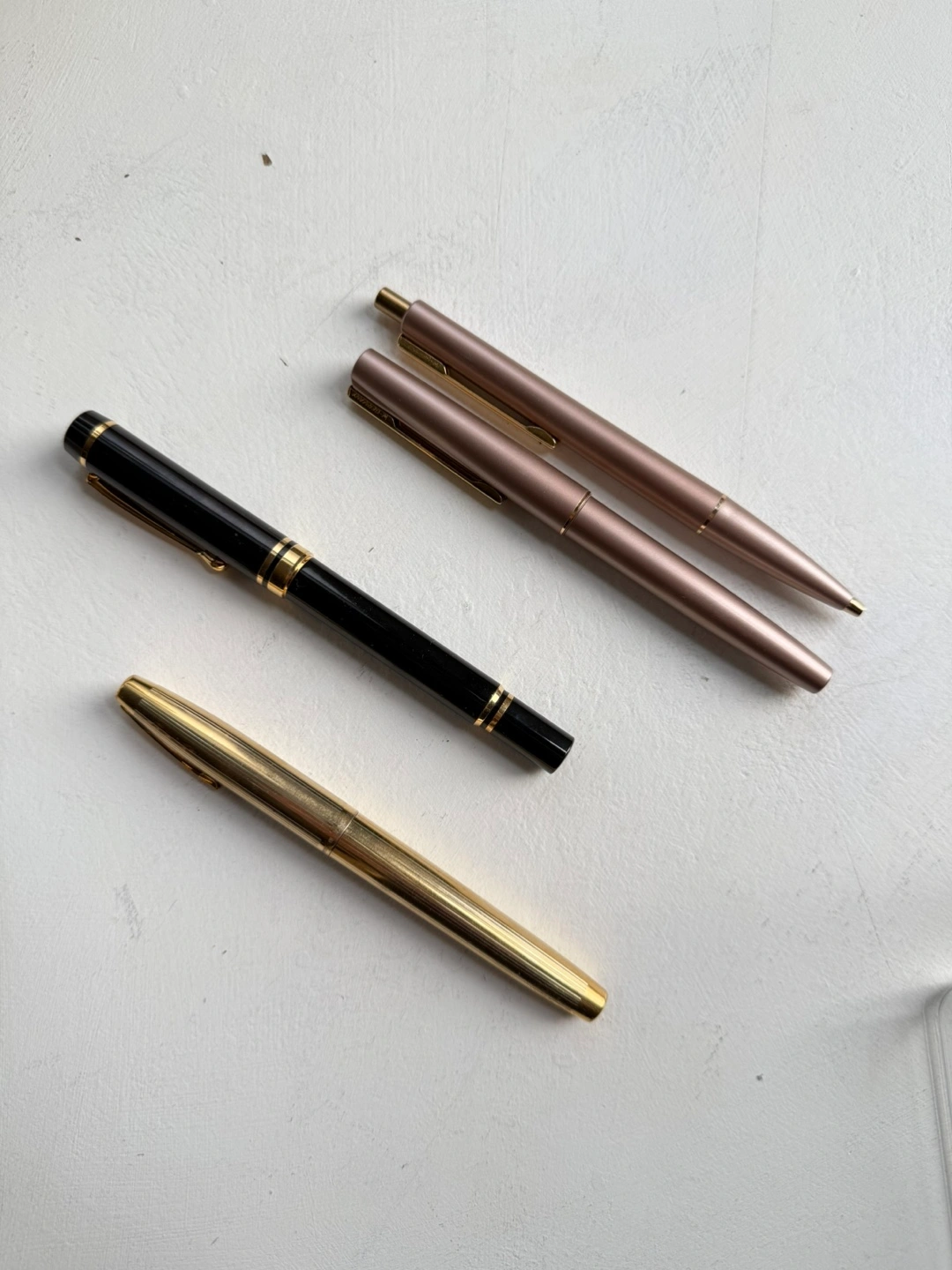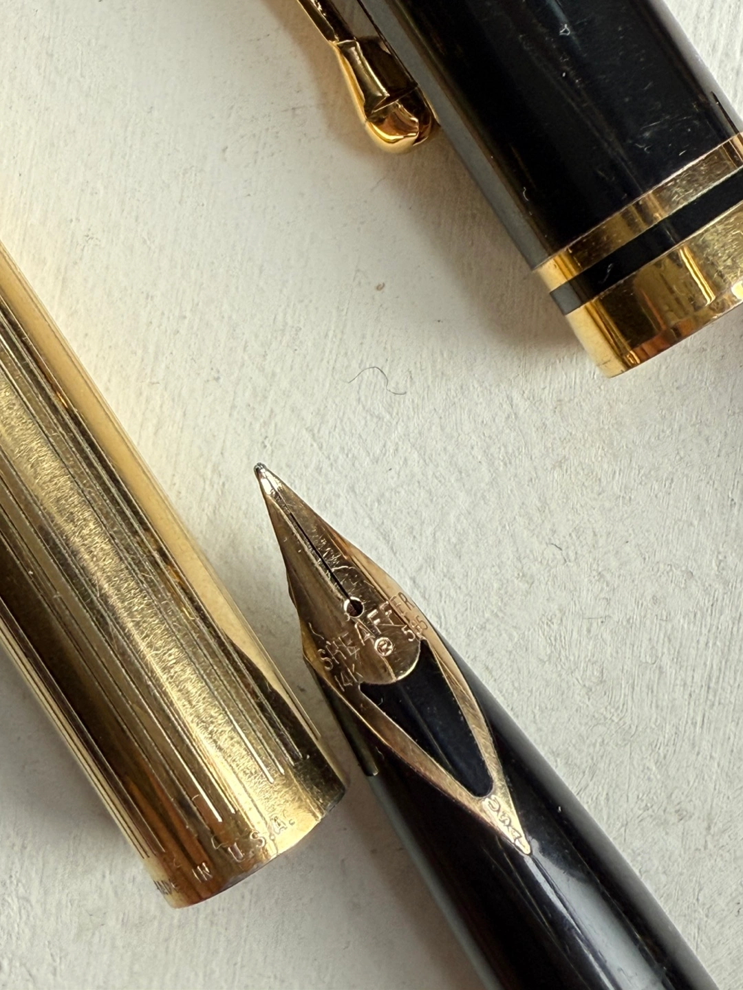 Four vintage pens 🖋️ Make me an offer! 1. Vintage Gold Sheaffer with linear design and 14K gold tip with 585 stamp (made in the U.S.A. - asking $225 2. Vintage German pen in black metal with gold accents and iridium tip; quite heavy - asking $50 3. Set of two (2) vintage Senator pens from Germany in rose gold melamine (durable plastic) and gold metal, one ballpoint and one fountain with iridium tips; perfect for writing with elegance and style - asking $100