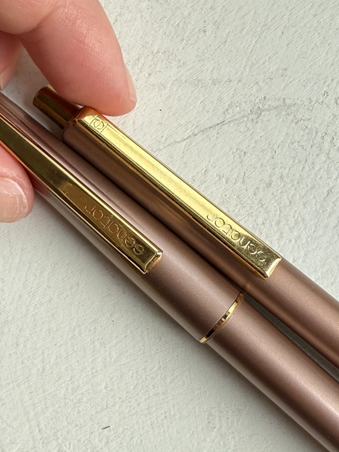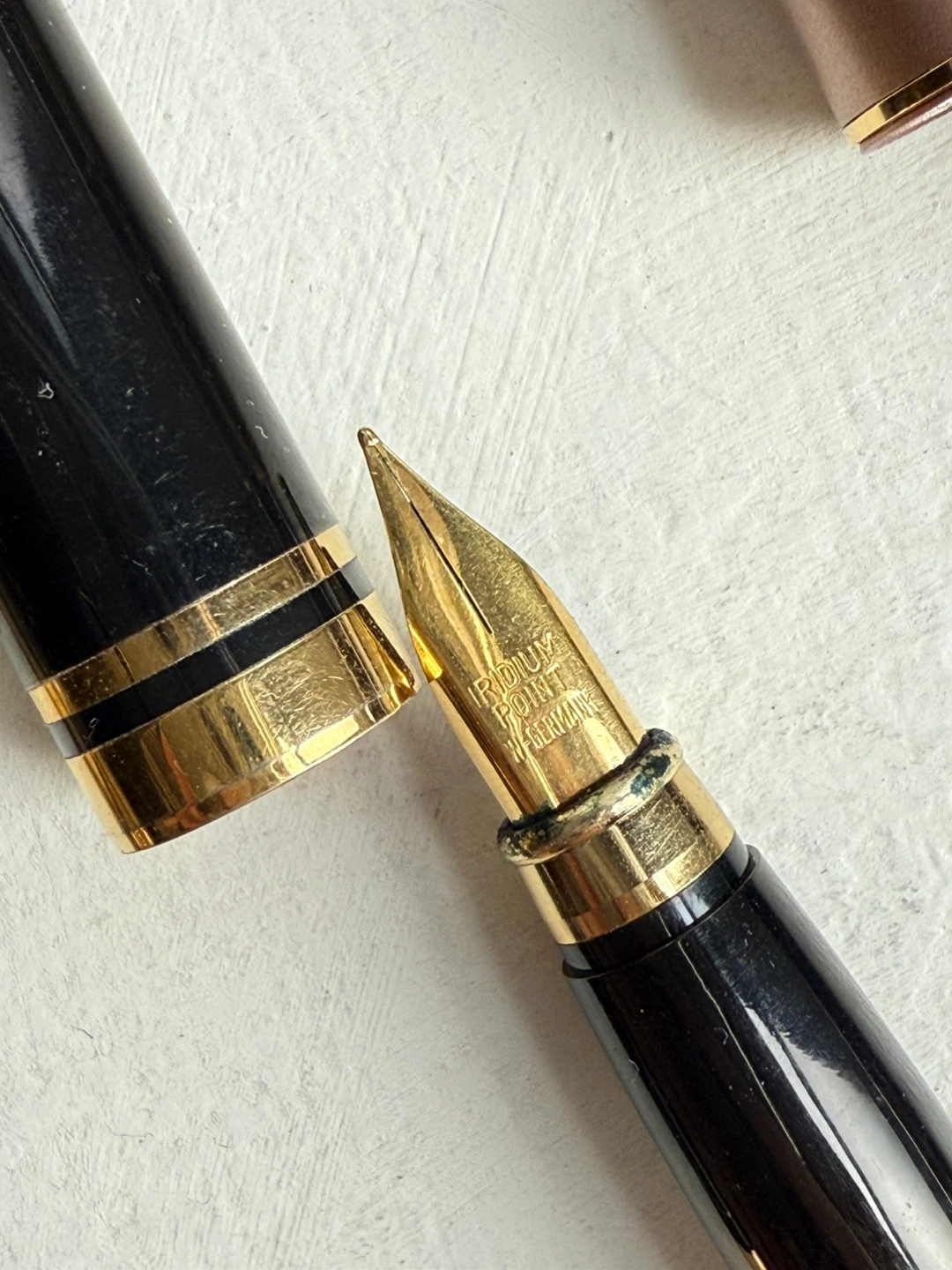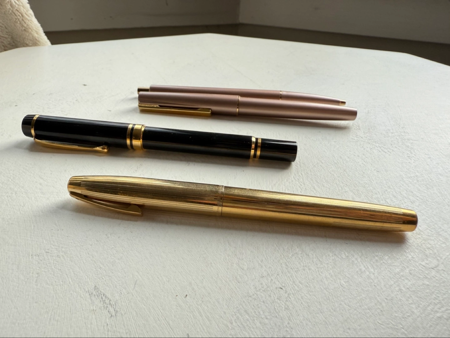 Four vintage pens 🖋️ Make me an offer! 1. Vintage Gold Sheaffer with linear design and 14K gold tip with 585 stamp (made in the U.S.A. - asking $225 2. Vintage German pen in black metal with gold accents and iridium tip; quite heavy - asking $50 3. Set of two (2) vintage Senator pens from Germany in rose gold melamine (durable plastic) and gold metal, one ballpoint and one fountain with iridium tips; perfect for writing with elegance and style - asking $100