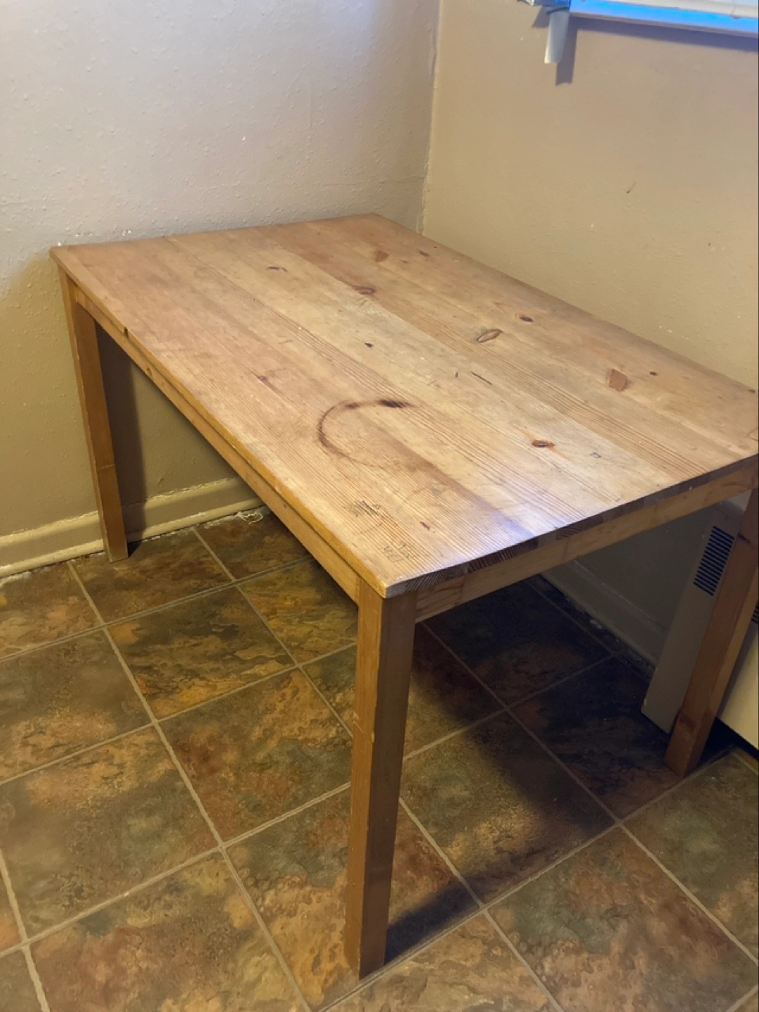Light brown wooden table. Simple design. Perfect for small spaces. Some minor wear.its a great table I used it to do my homework and Paperwork. I will only take cash and pick up