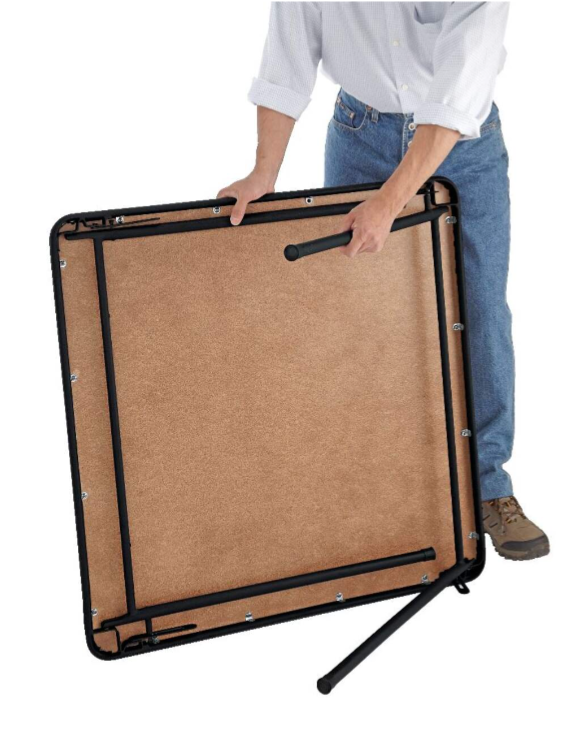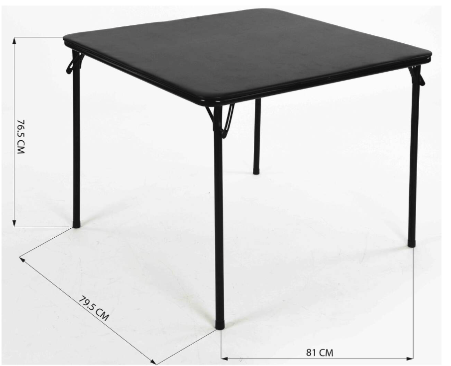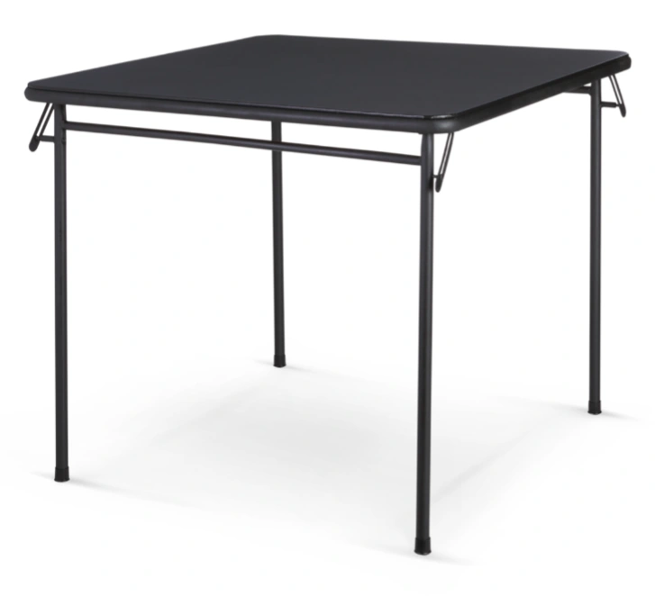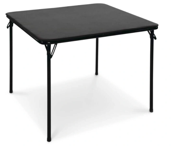 Black foldable square table. Metal frame. Easy to store. Perfect for small spaces. Lightweight and portable.