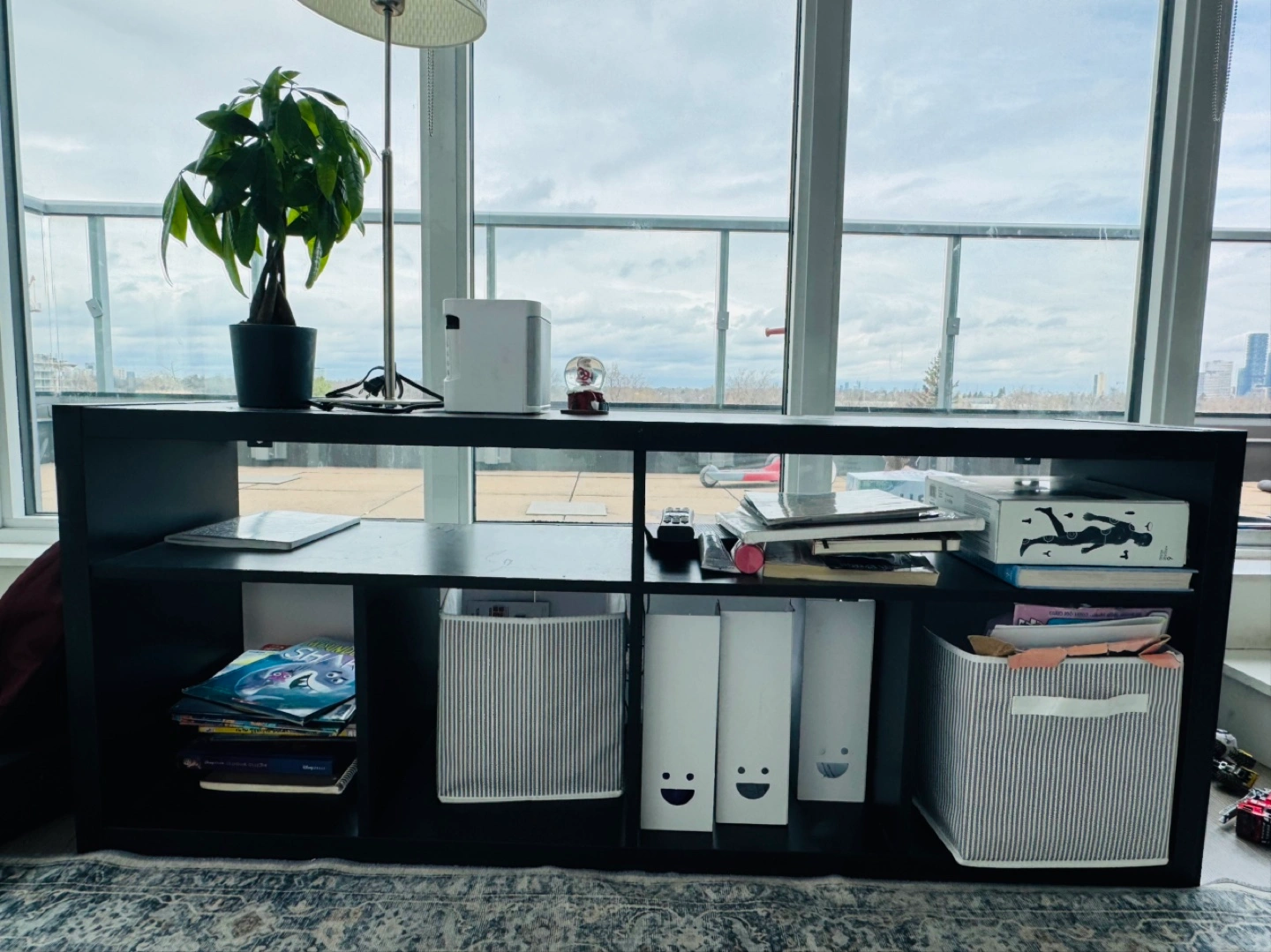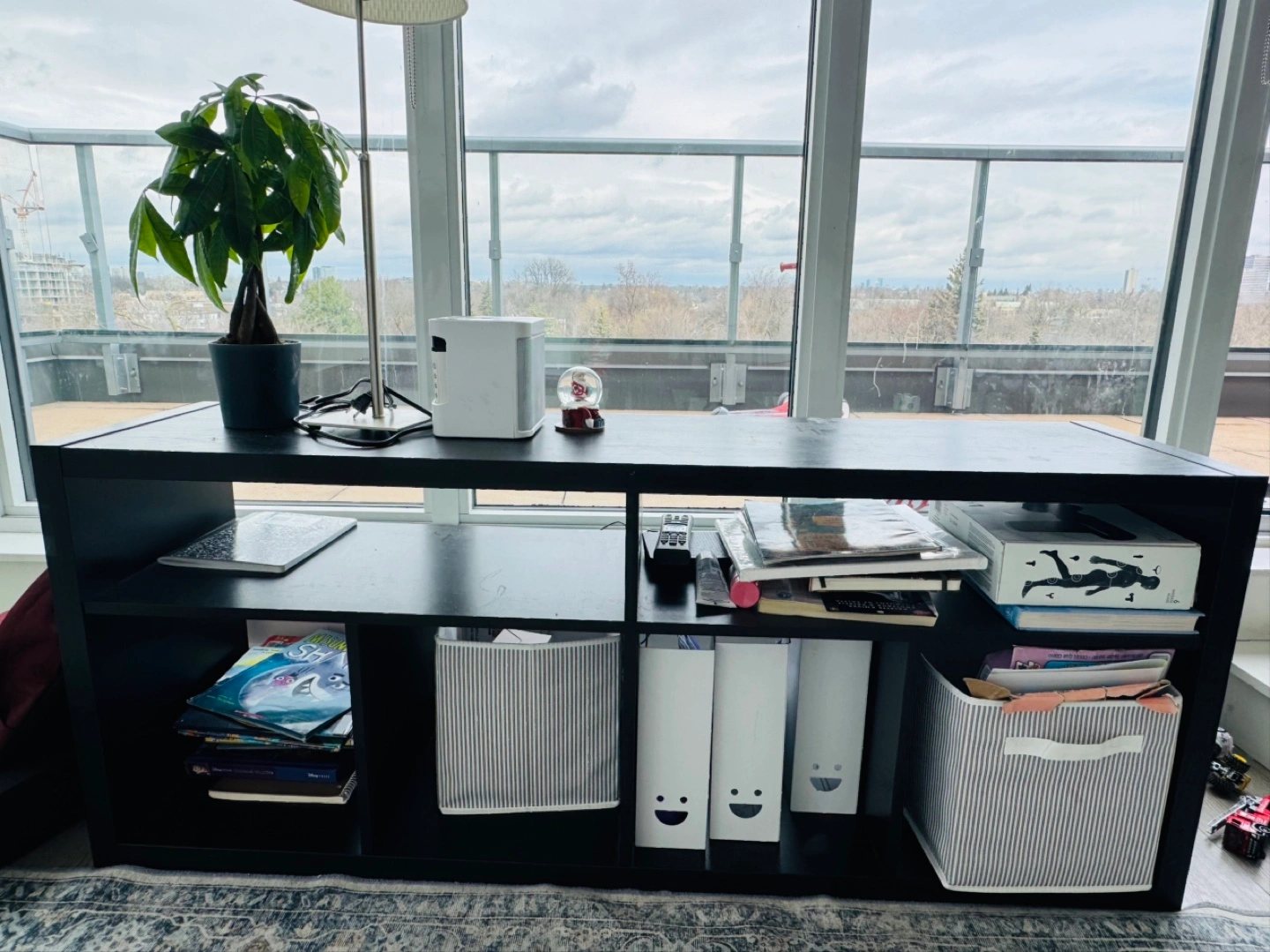 Black-brown Kallax shelving unit. Eight cube compartments. Great for storage and organization. NO DAMAGE ANYTHING ON IT.