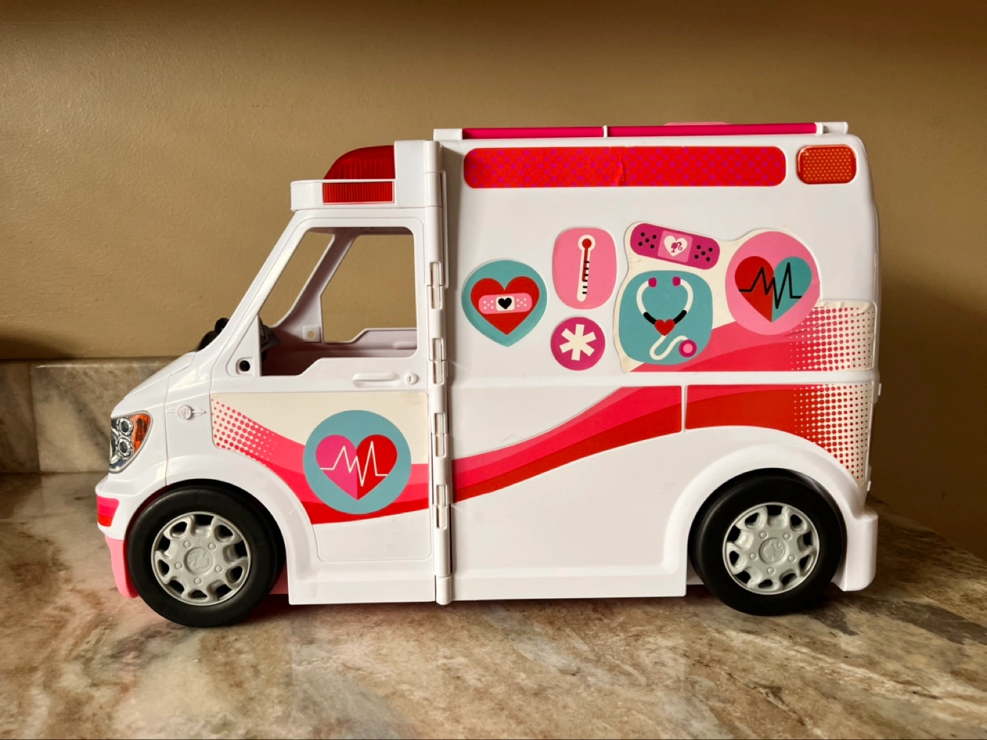 Adorable Barbie® branded ambulance playset. Features opening sides, revealing a fully equipped clinic. Includes various medical accessories and a stretcher. Great for imaginative play. Has a working flashing siren!