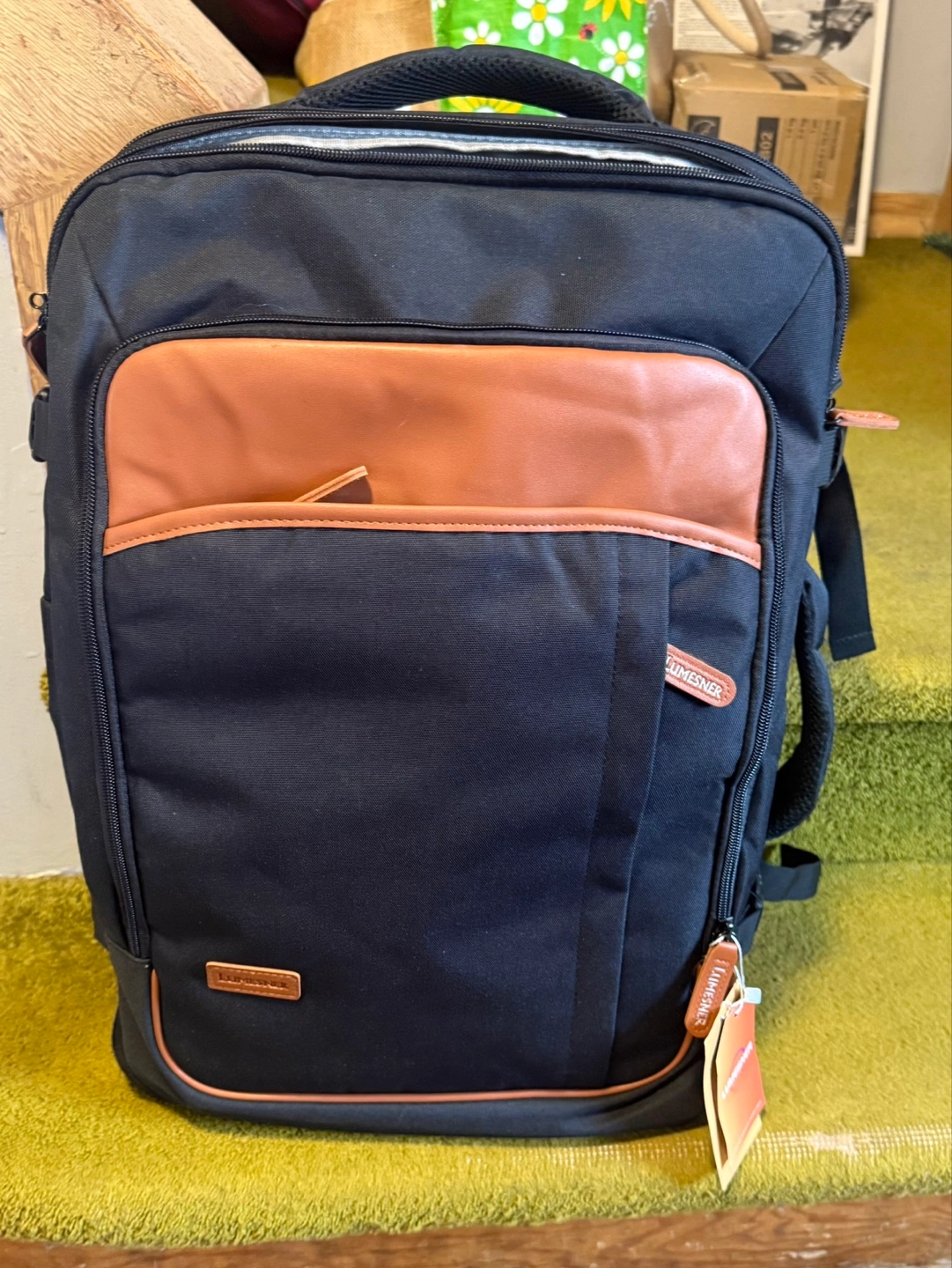 Black carry-on travel backpack. Tan leather accents. Includes several packing cubes for organization. Has usb plug for your phone or laptop. Great for weekend trips or flights.