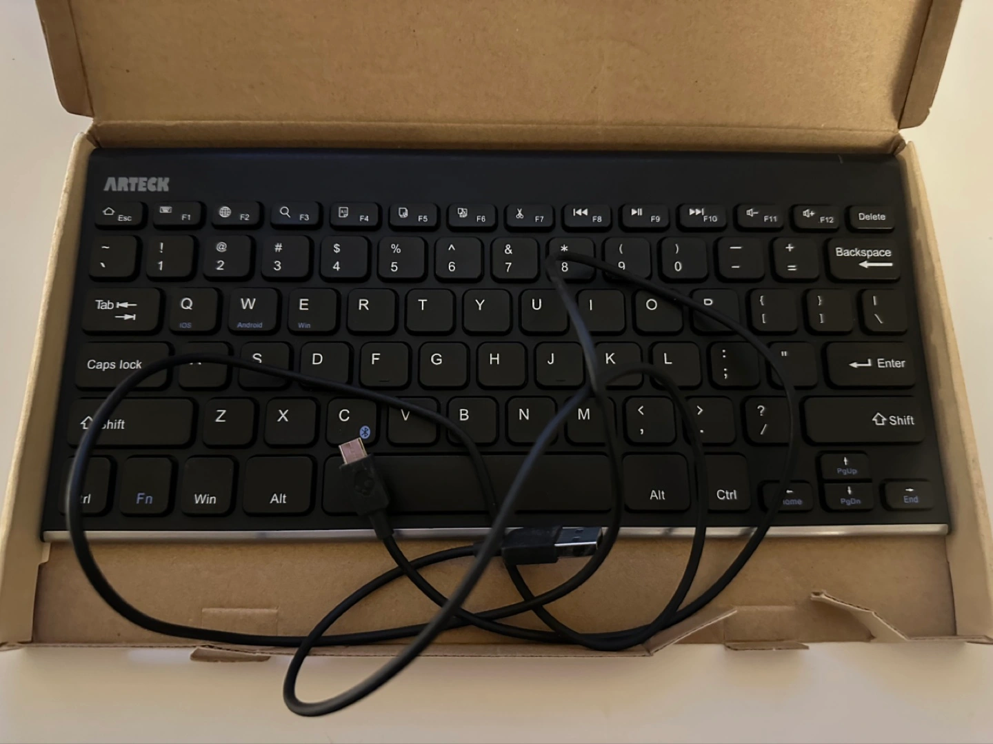 Compact keyboard. Bluetooth connectivity. USB charging cable included. Sleek design. Good condition.