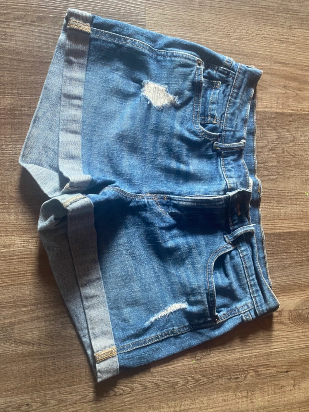 Rolled cuff denim shorts. Light wash denim. Distressed detailing. Five-pocket style. Good condition. Size 6 old navy
