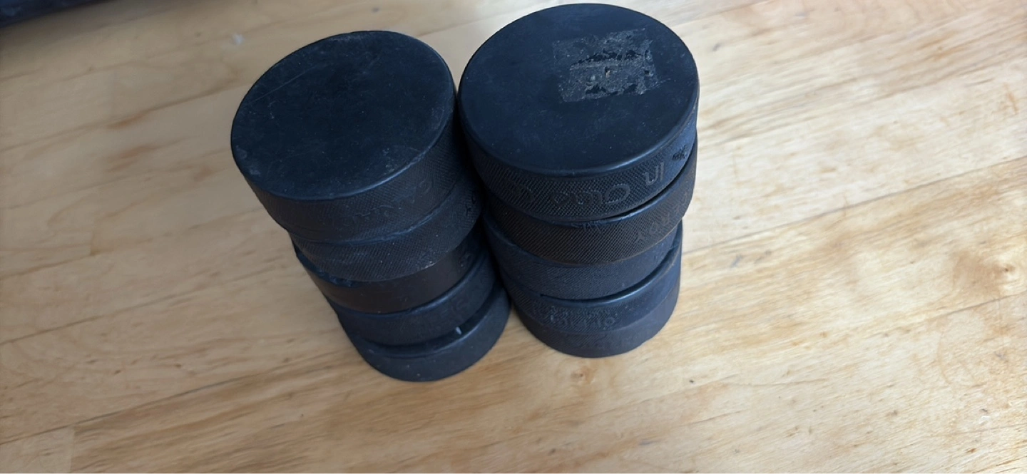 77Lot of used hockey pucks. Good for practice or casual play. Some wear and tear. All 10 for 5$