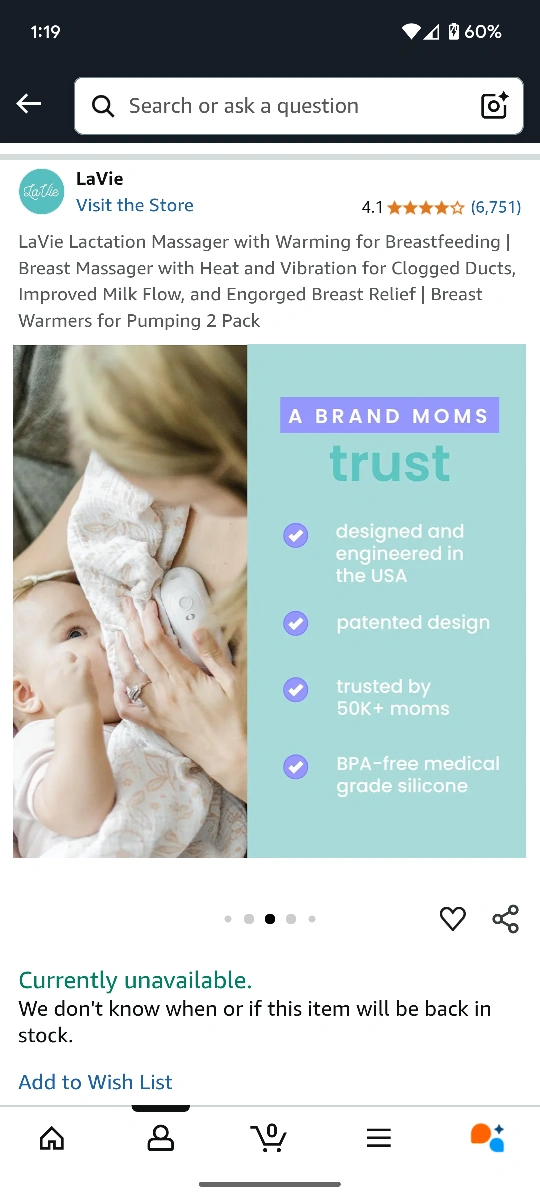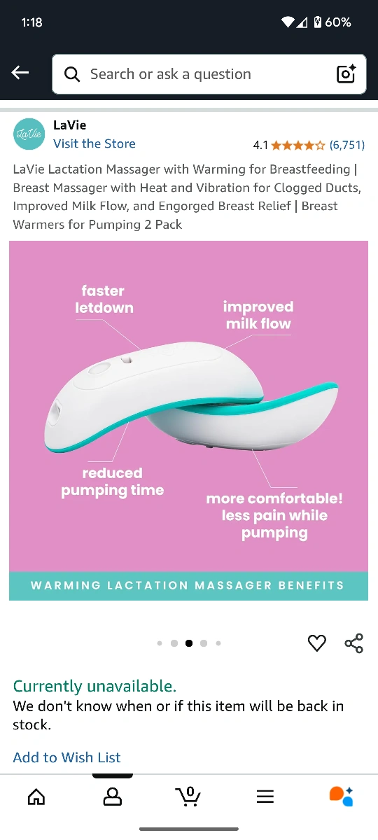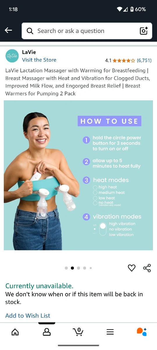LaVie breastfeeding massager with heat and vibration. Two massagers included. Rechargeable battery. Multiple heat and vibration settings. Includes carrying pouch. Medical grade silicone.