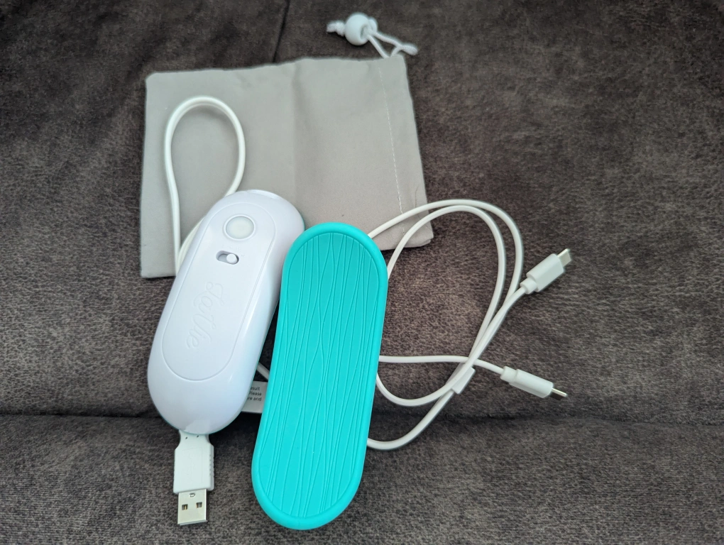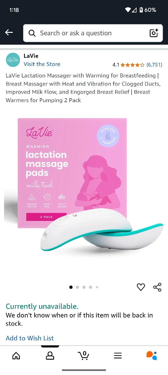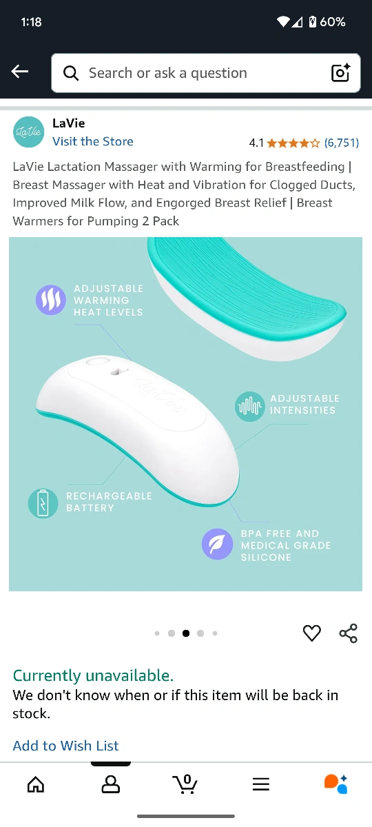 LaVie breastfeeding massager with heat and vibration. Two massagers included. Rechargeable battery. Multiple heat and vibration settings. Includes carrying pouch. Medical grade silicone.