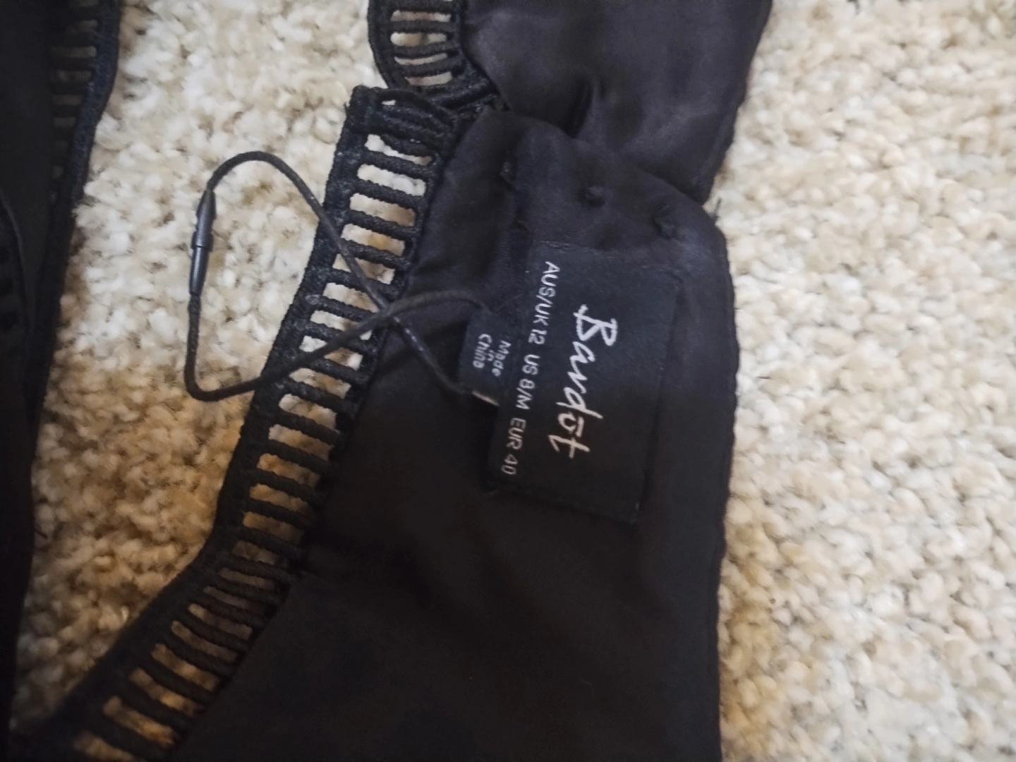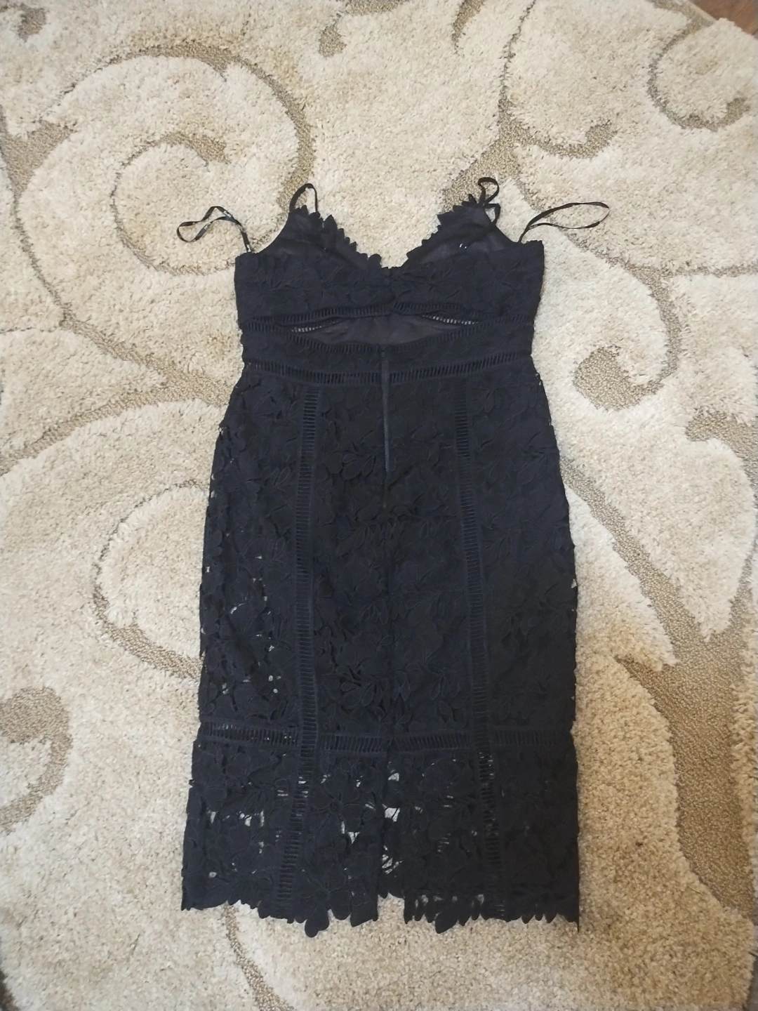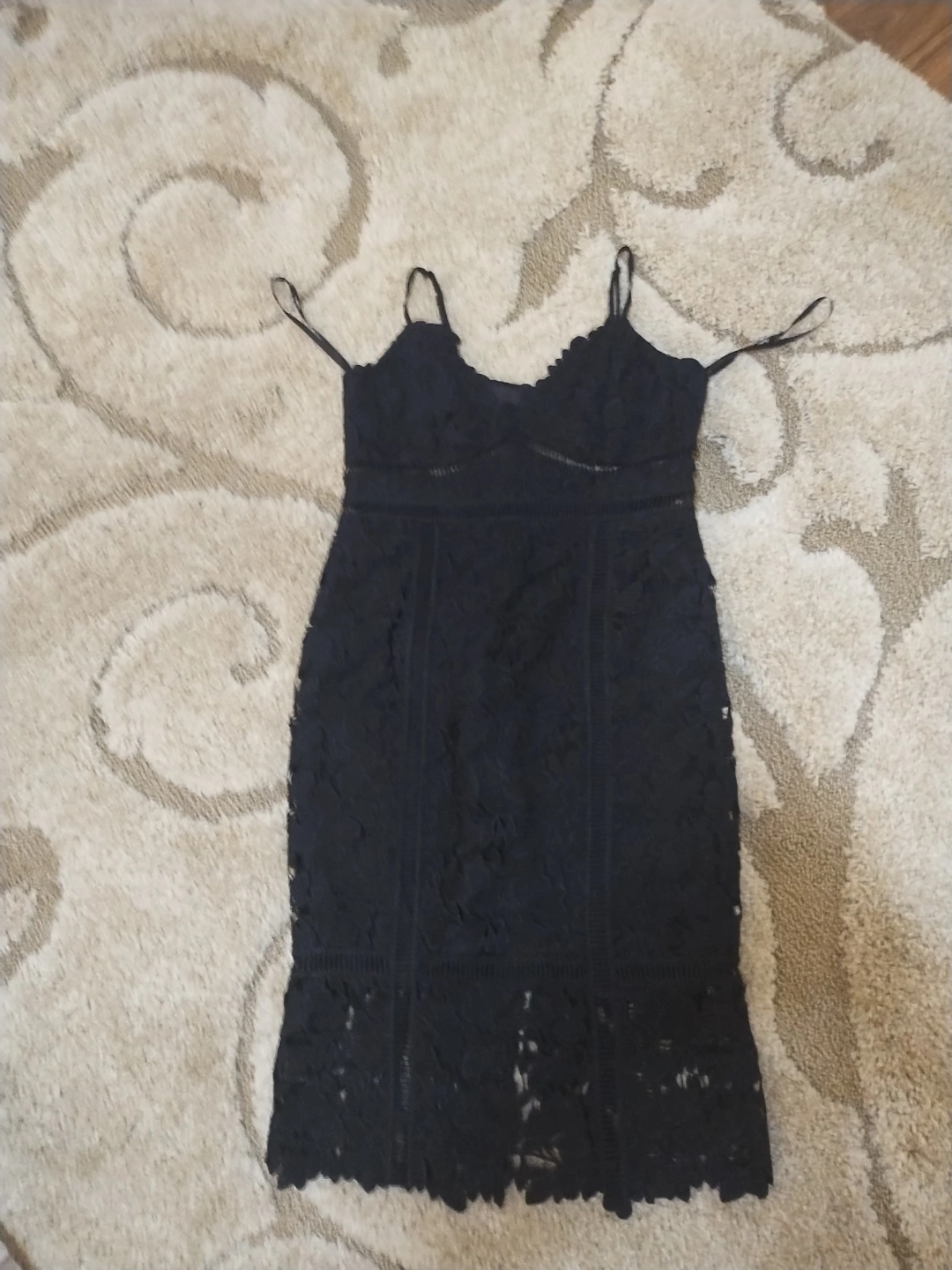 Stunning black lace midi dress. Features spaghetti straps, a V-neckline, and a cut-out back detail. Fitted silhouette, midi length. Beautiful detailing throughout.